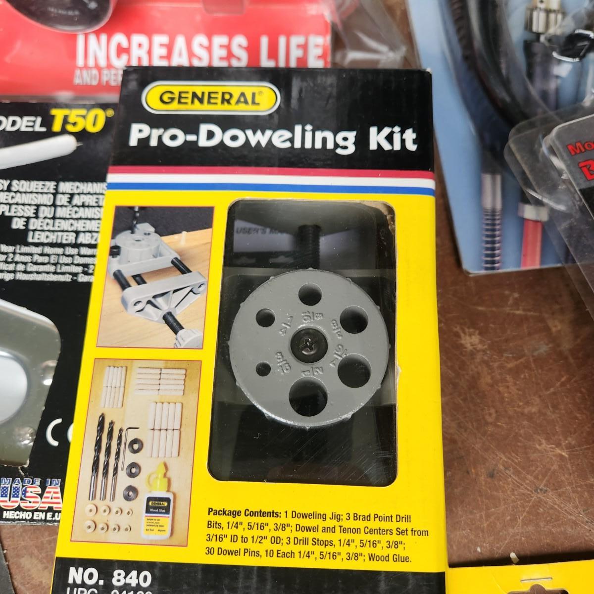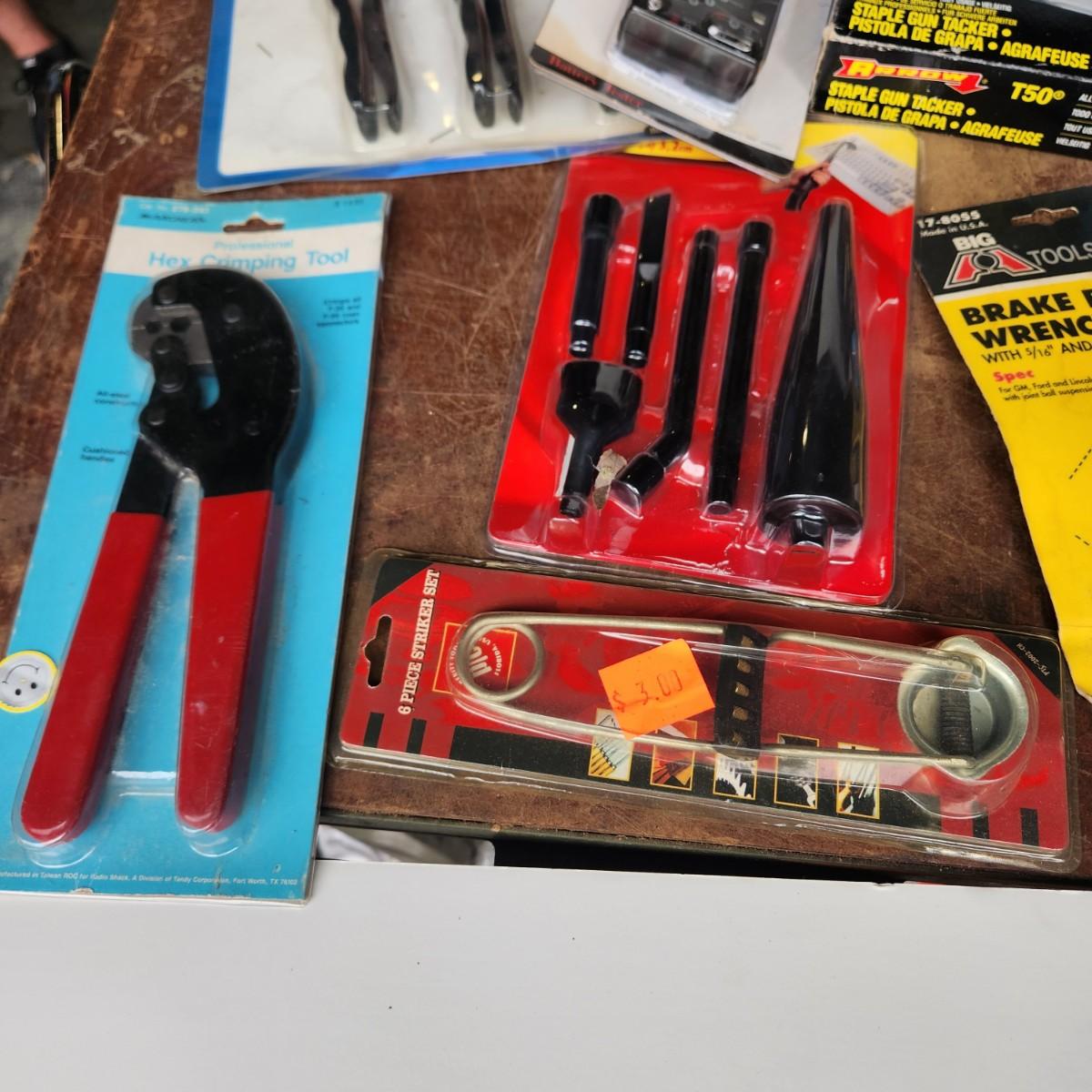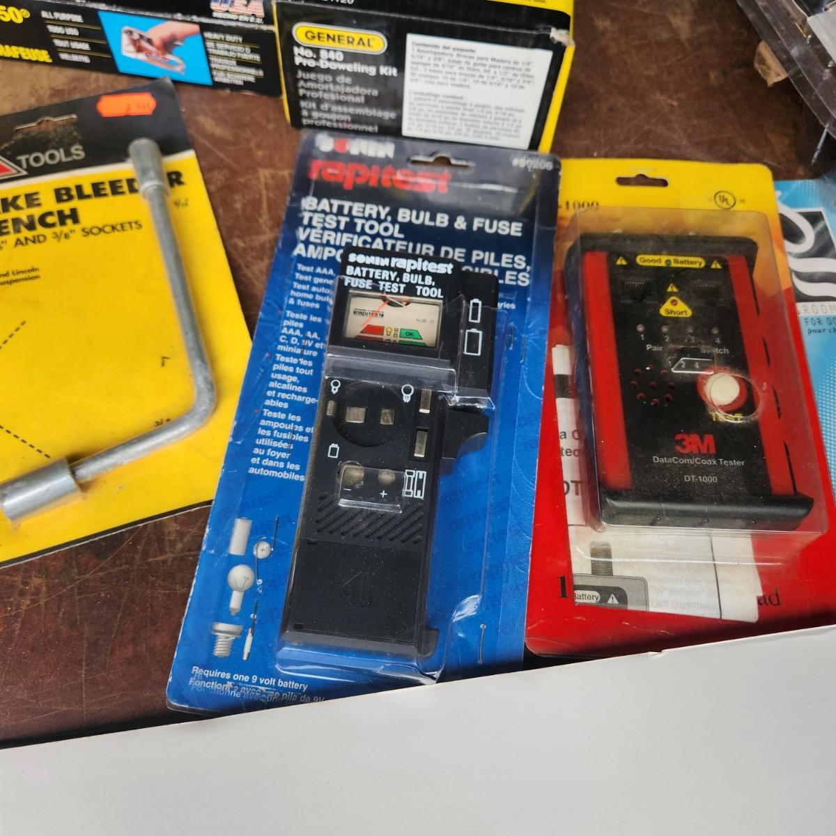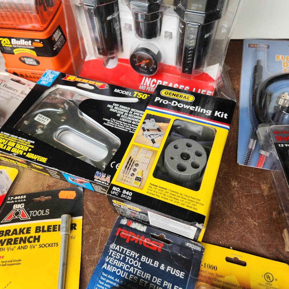 Box lot of New Tools in original package Dowrling Kit, Battery testers , Arrow T50 Stapler Black And Decker Drill Bits Hex Crimping tool