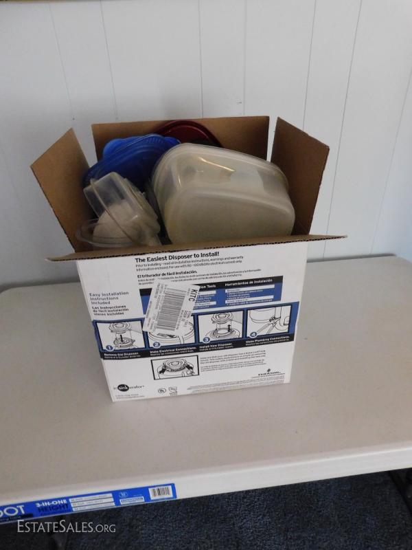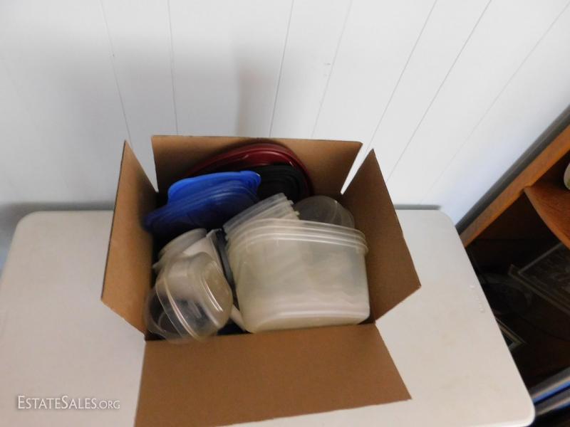Large box of various sizes, colors, and shapes of plastic containers and lids. Needs cleaning.