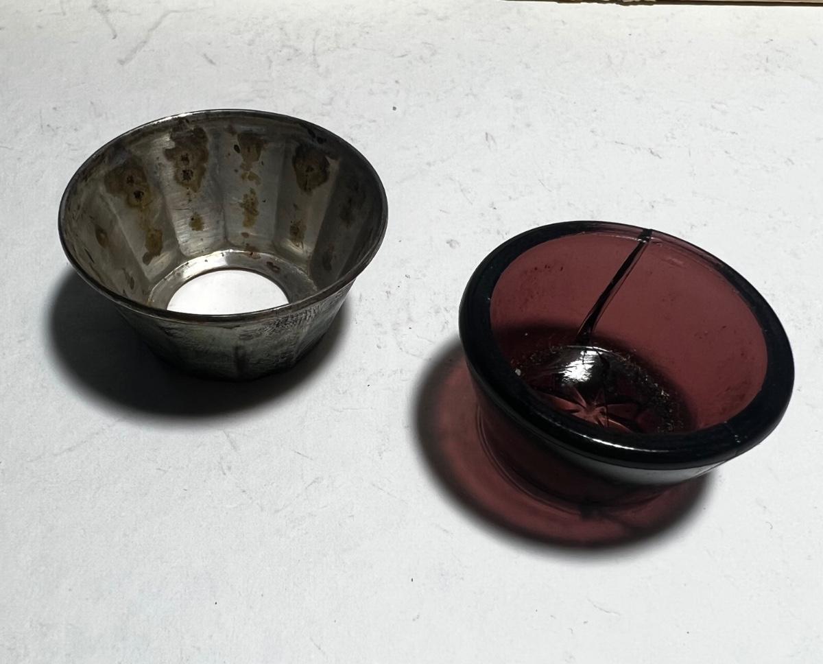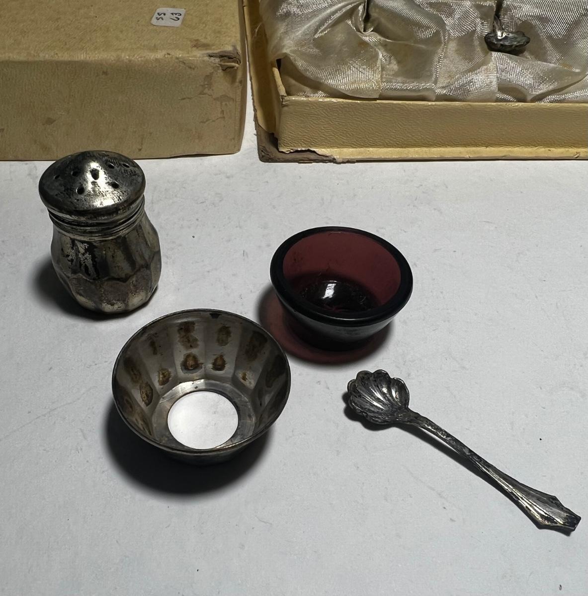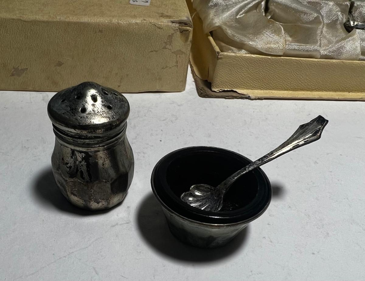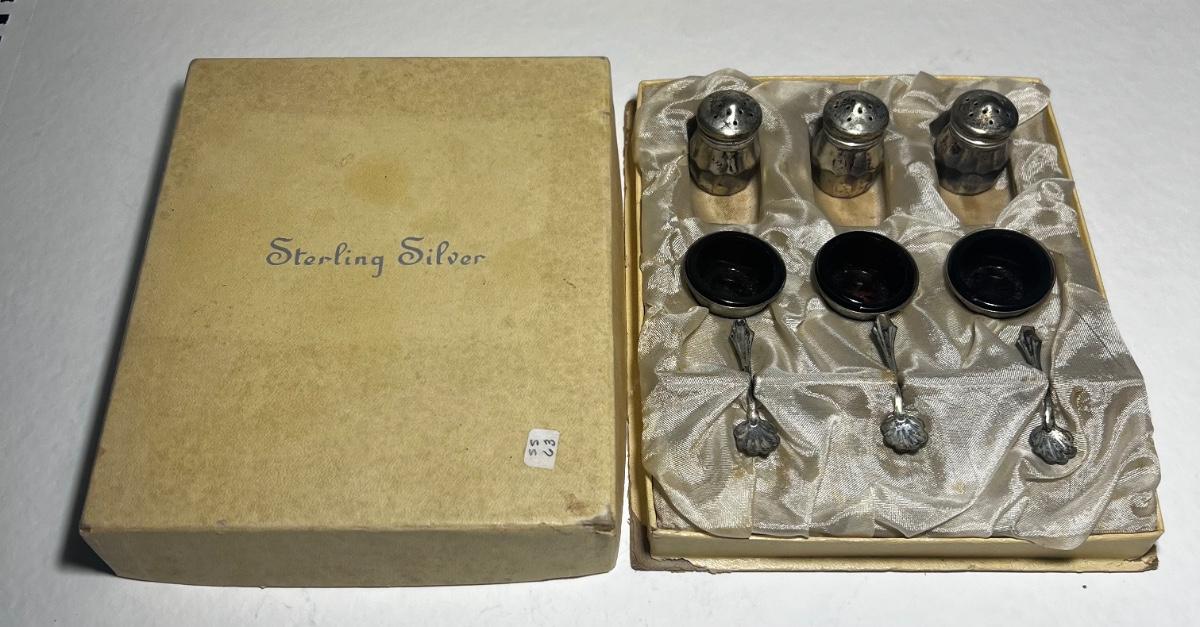 Box of 3 Pepper, 3 Spoons, 3 Open Salts with Amethyst one is broken. All Sterling Silver
