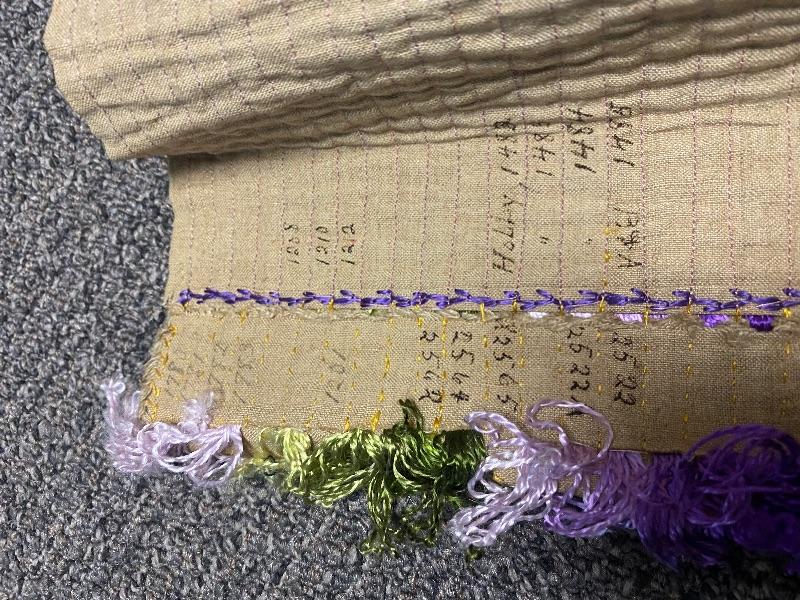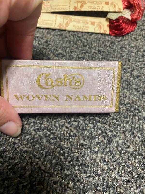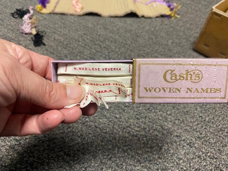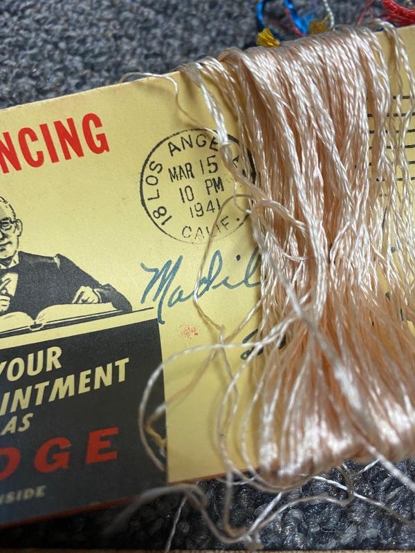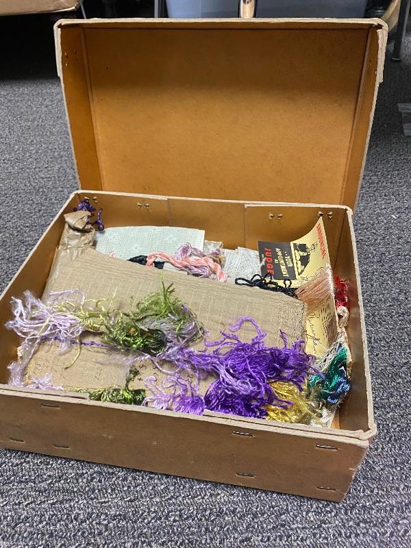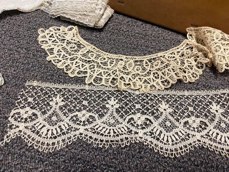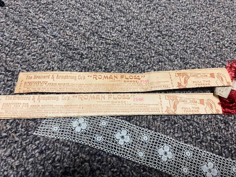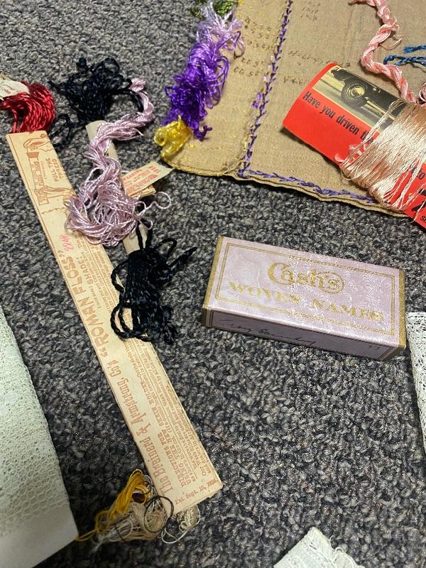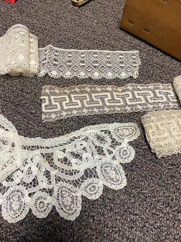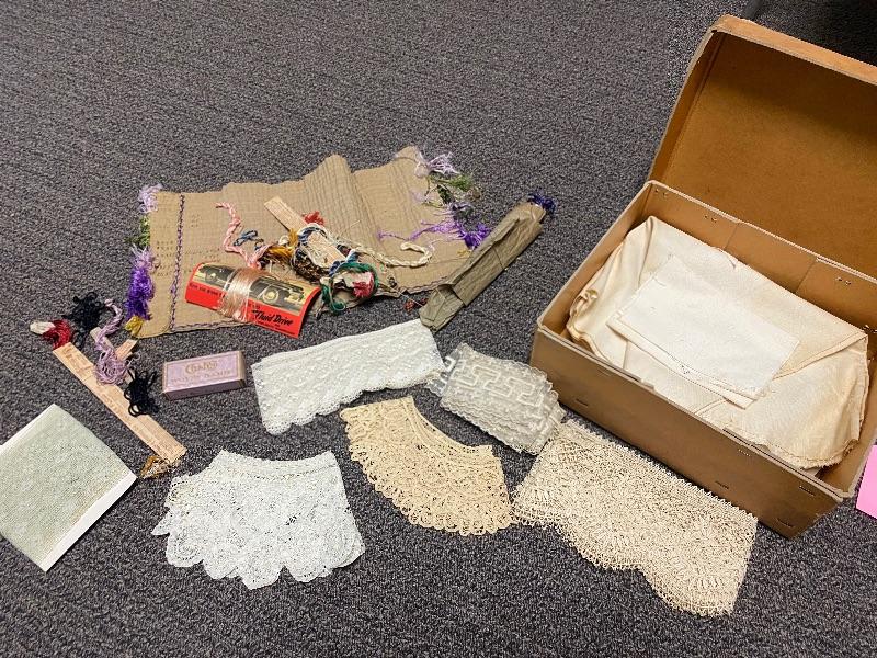 Box of antique & vintage lace, embroidery thread, and plain white linen. 6 different lace styles, 2 are curved like collar pieces. Some embroidery thread in original packaging. A handmade floss holder, color identifier and some plain white linen pieces. Linen is discolored along edges from age and the way it has been stored. The card thread is wrapped around is postmarked 1941.