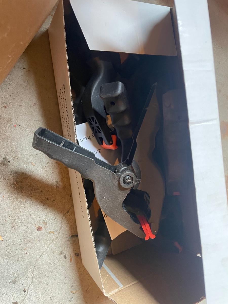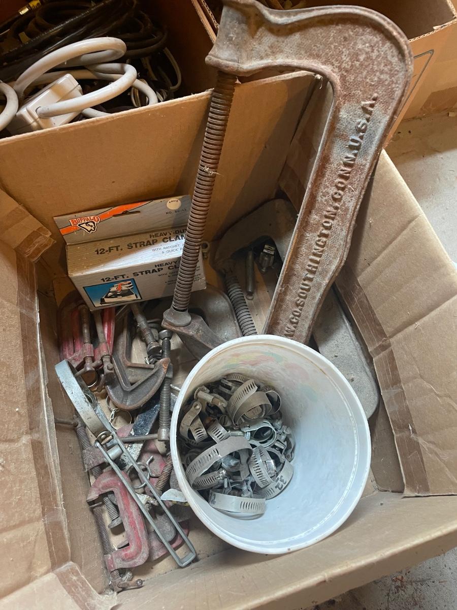 Box of assorted clamps, plastic, and metal
