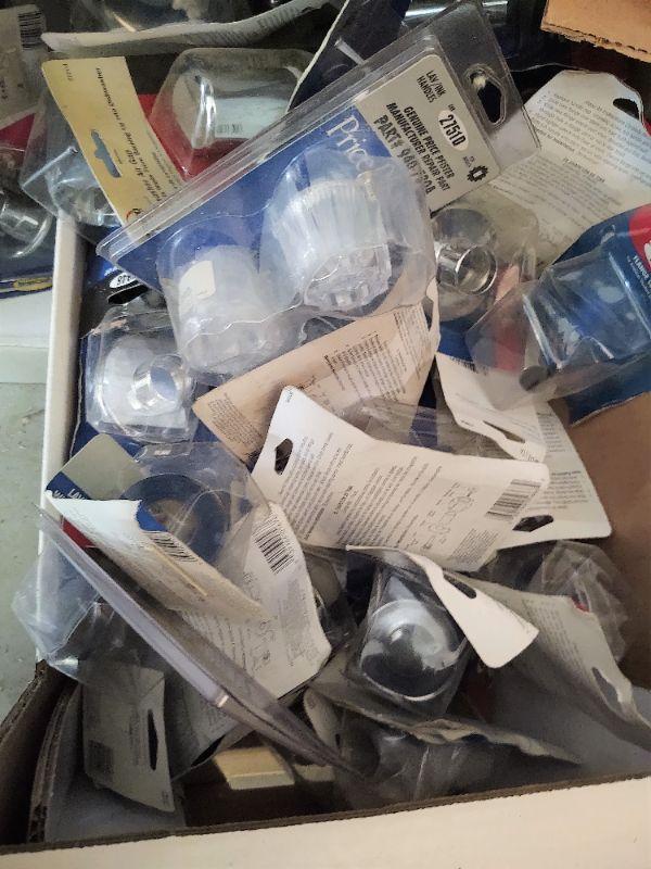 Box of assorted parts in original packages tub flange set, tub flange, cam assembly, strainer, washers, diverter, etc.