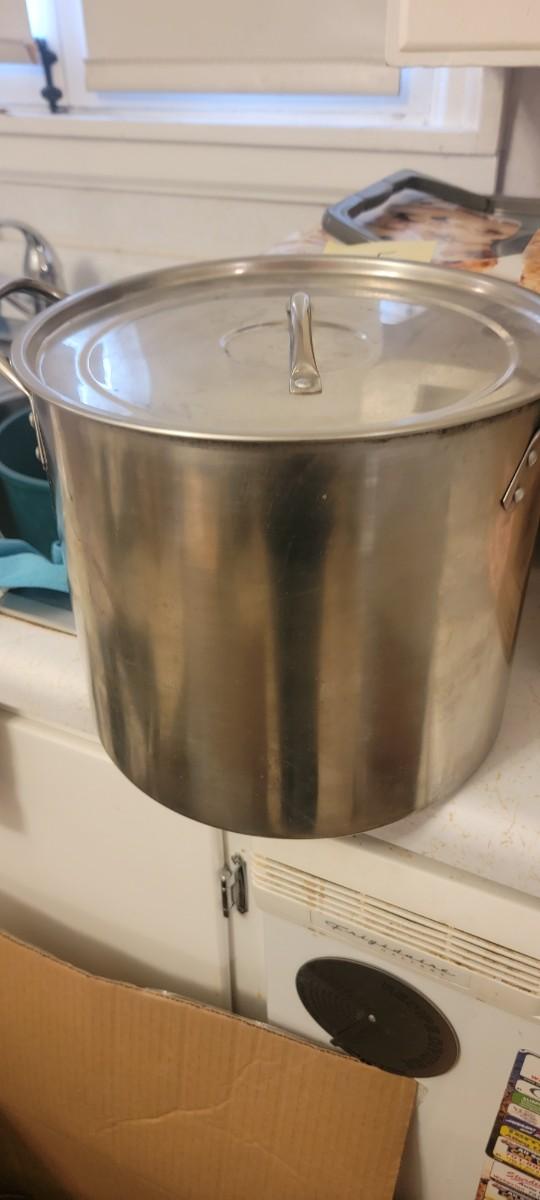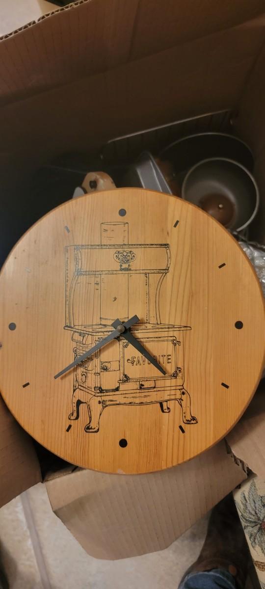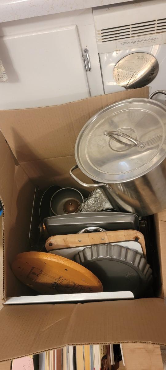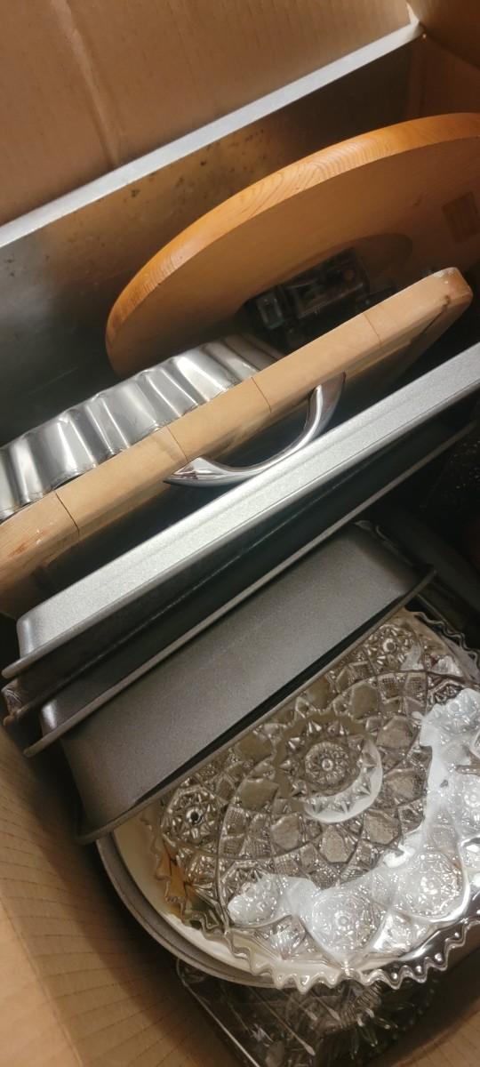 Box of surprise kitchen! Baking pans, stock pot, clock, platters...more!