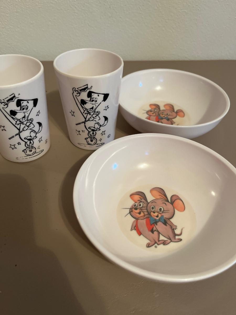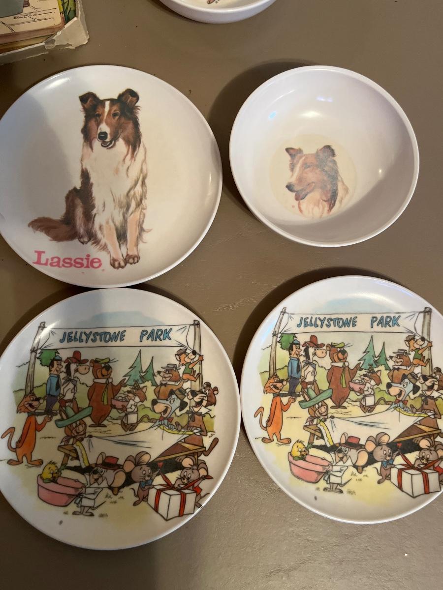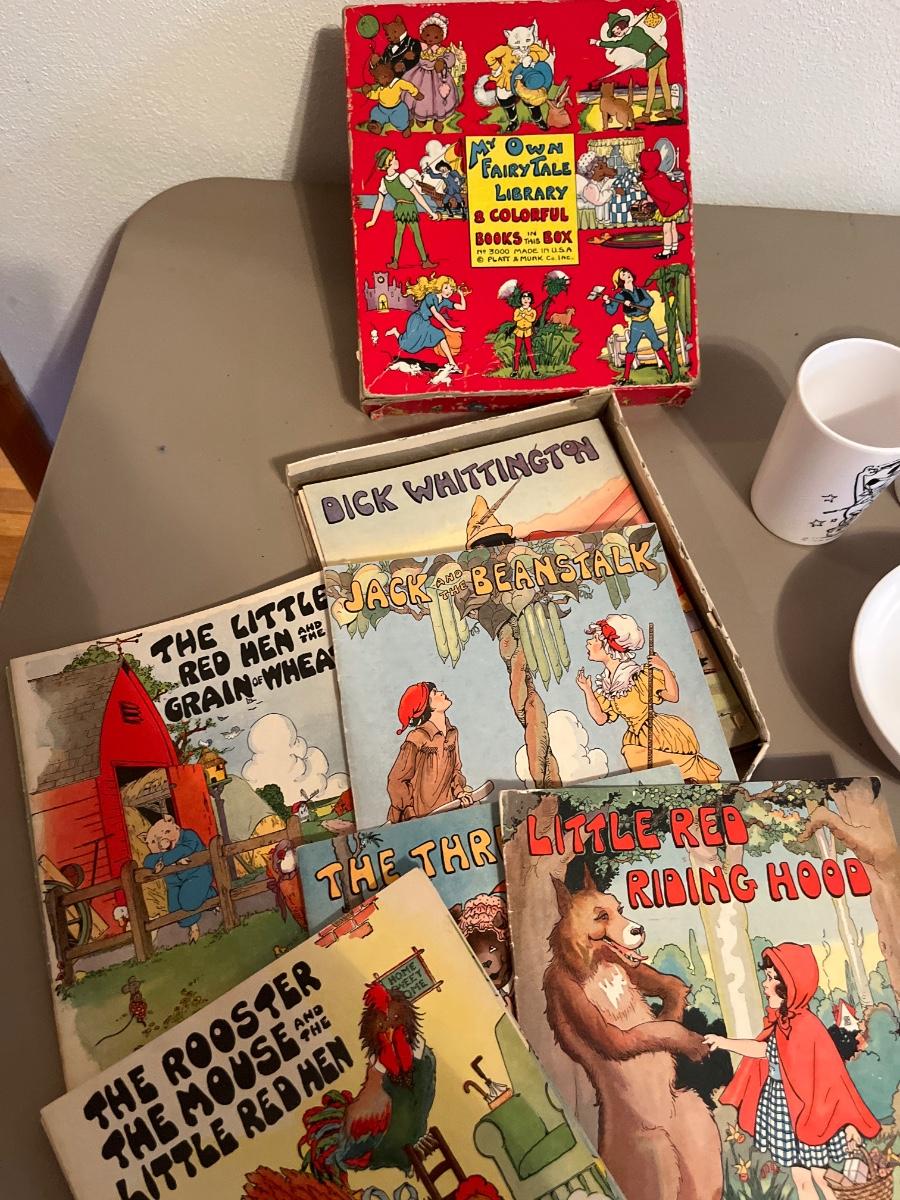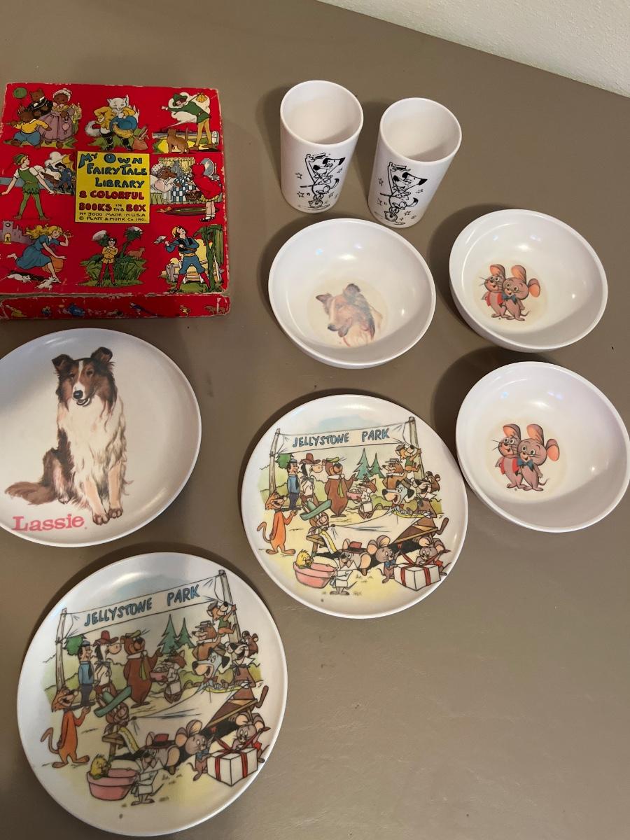 Box of books and plastic kids dinnerWare