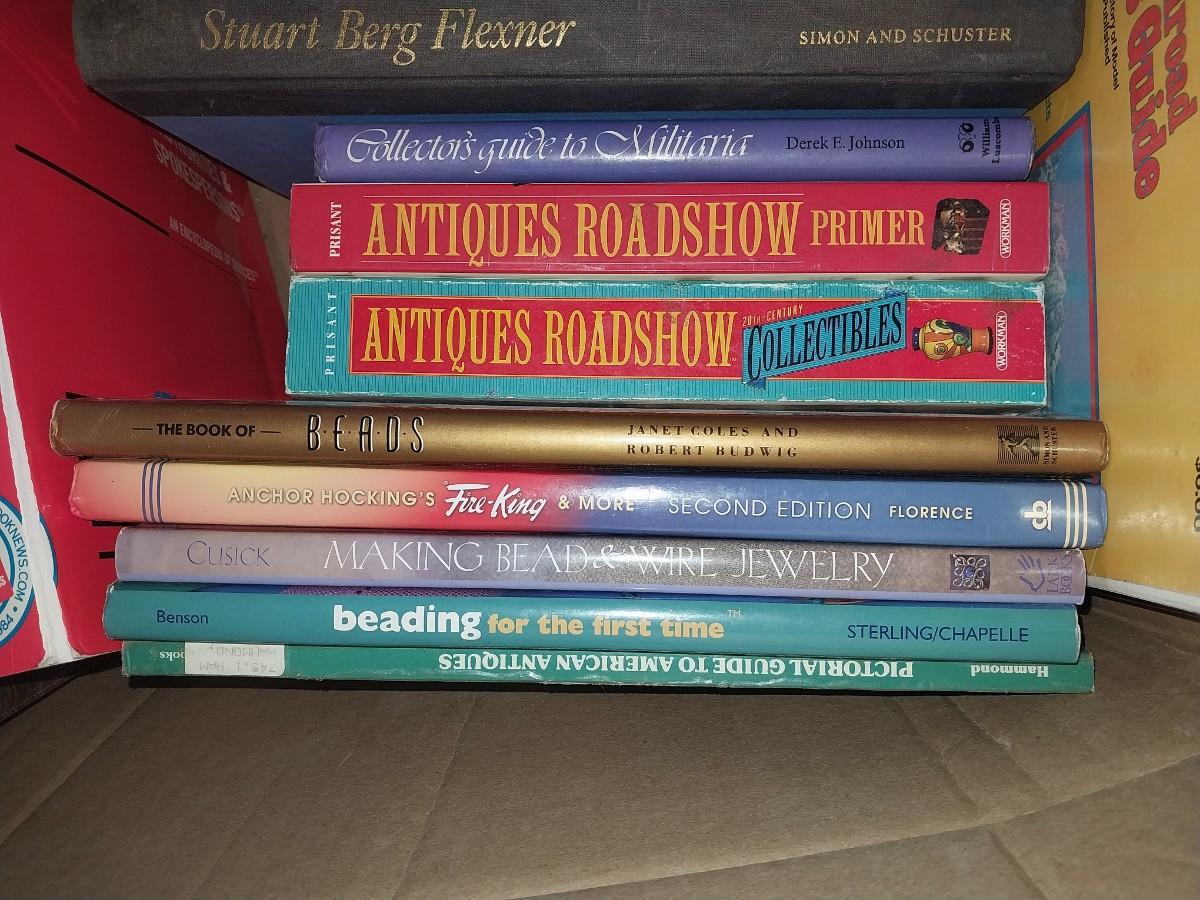 BOX OF BOOKS; BEADS-ANTIQUE ROADSHOW-JEWELRY MAKING-FIREKING AND MORE