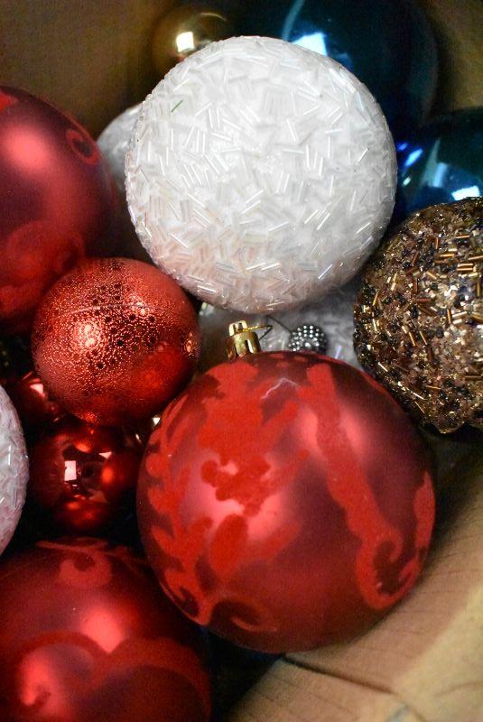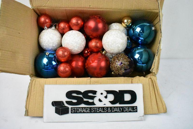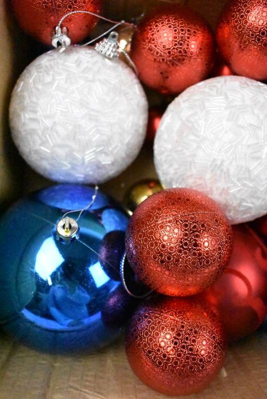Box of Christmas Ornaments. Mostly Red/White/Blue