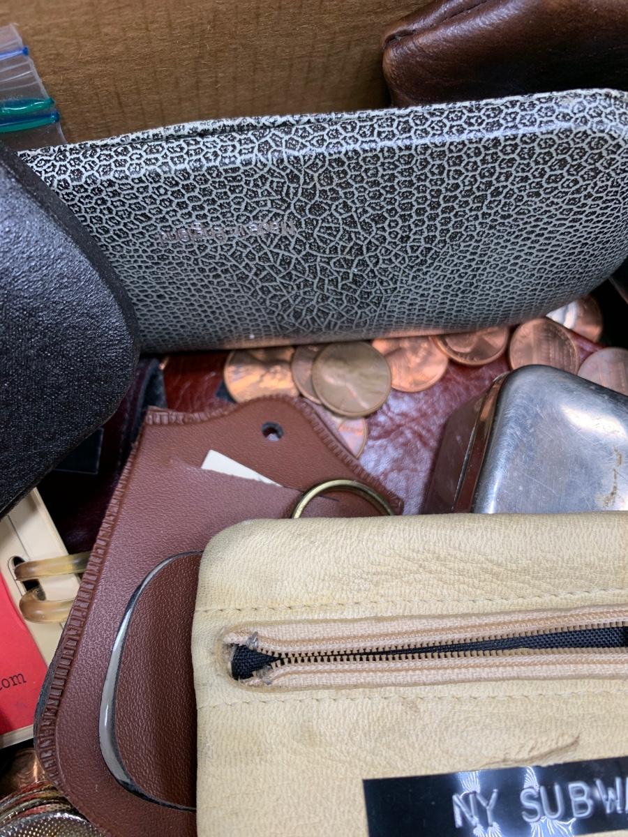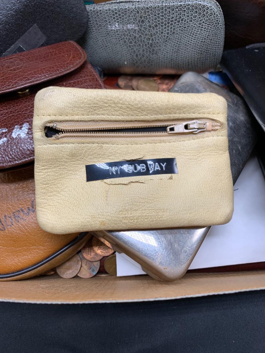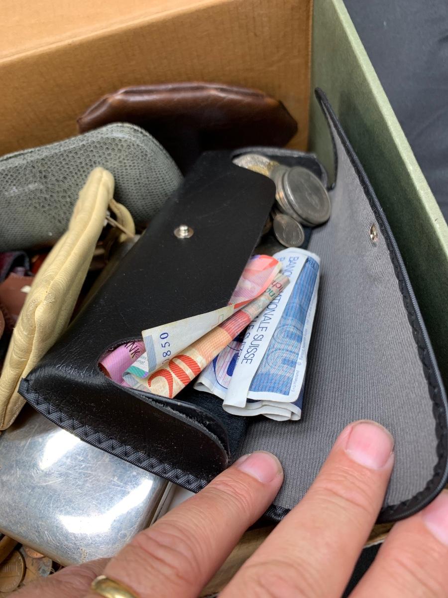Box containing notes and coins from all over the world including subway tokens and fine quality leather wallets