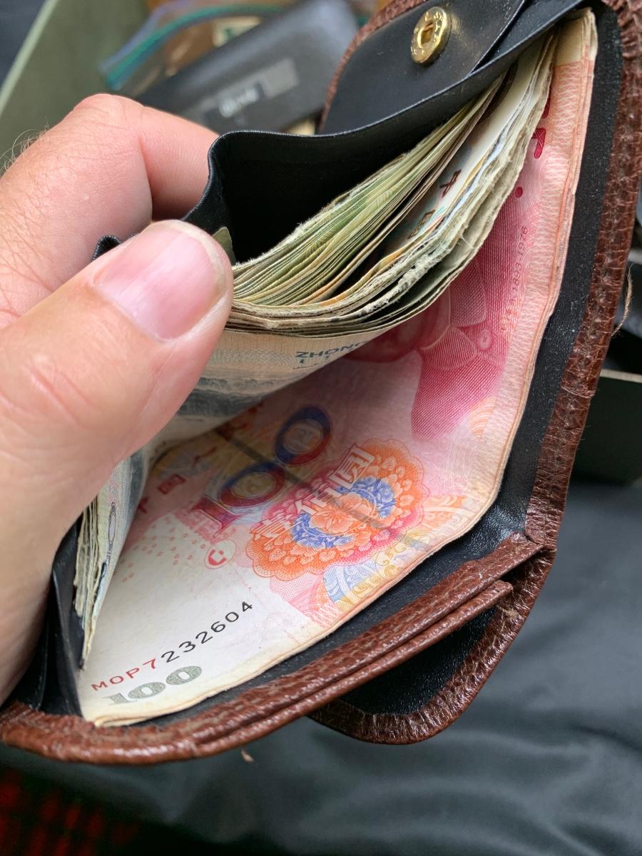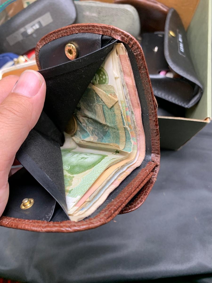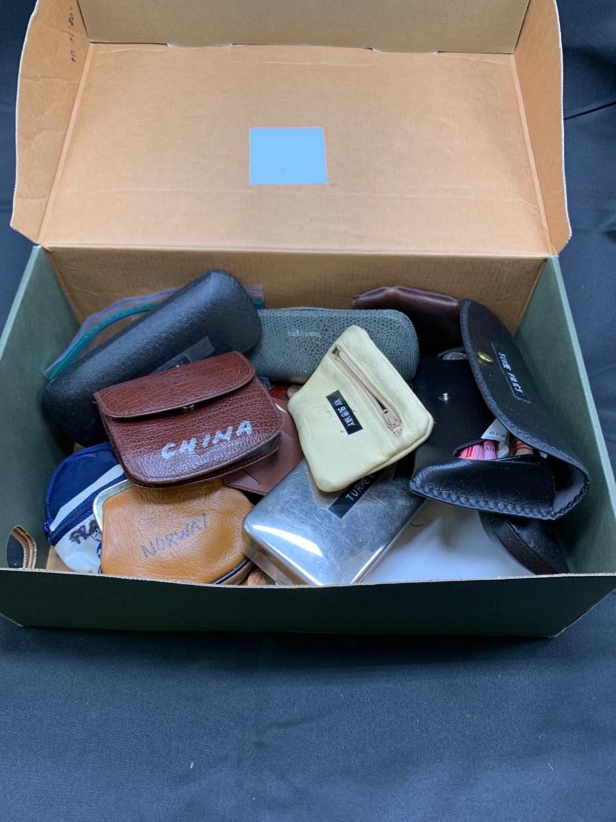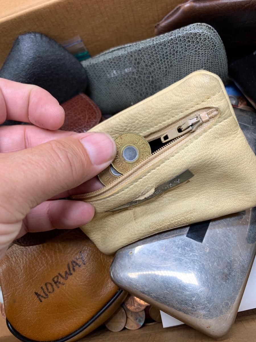 Box containing notes and coins from all over the world including subway tokens and fine quality leather wallets