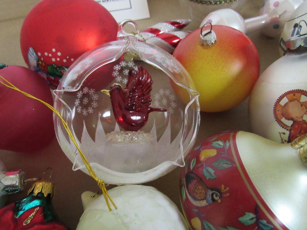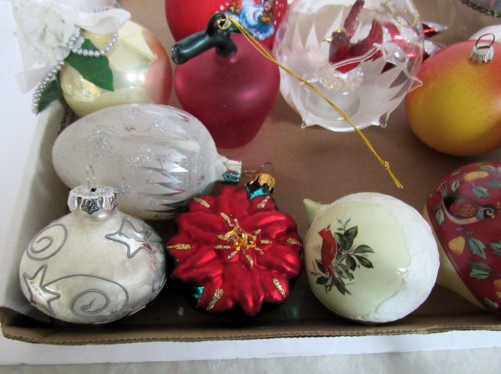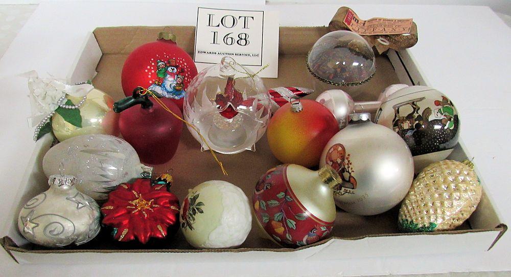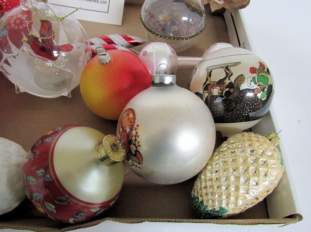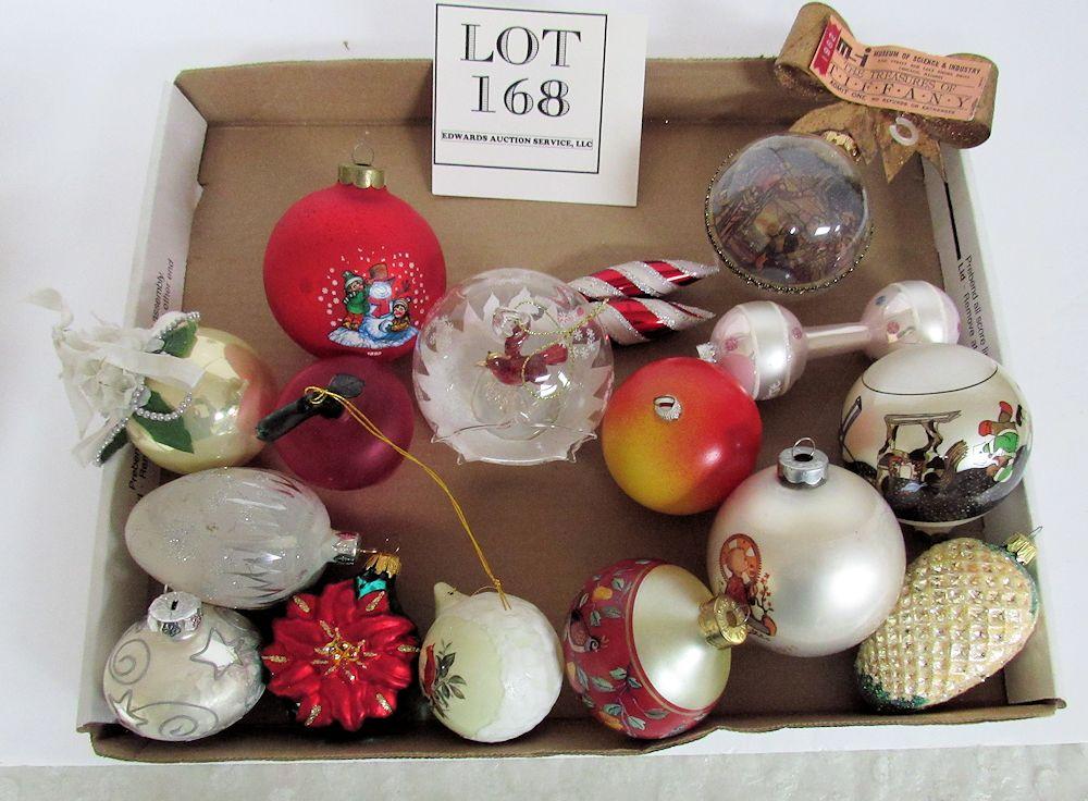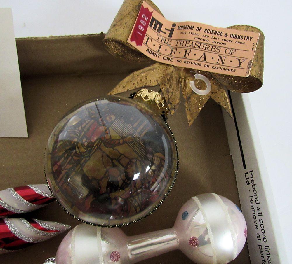 Box of Contemporary Christmas Ornaments, Glass, One Unusual From Tiffany Display at Museum