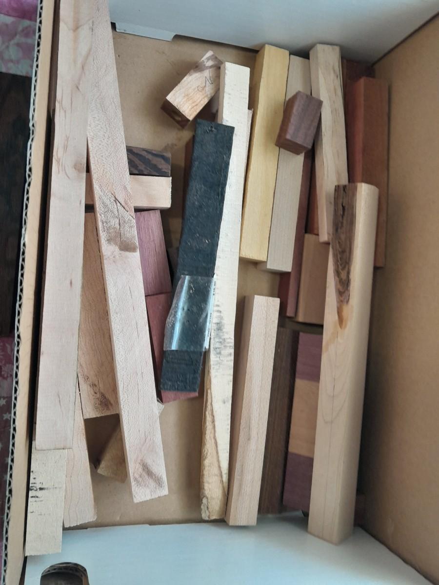 Box of crafting hardwood, Maplewood, poplar. and more small pieces for pen making and other crafts.
