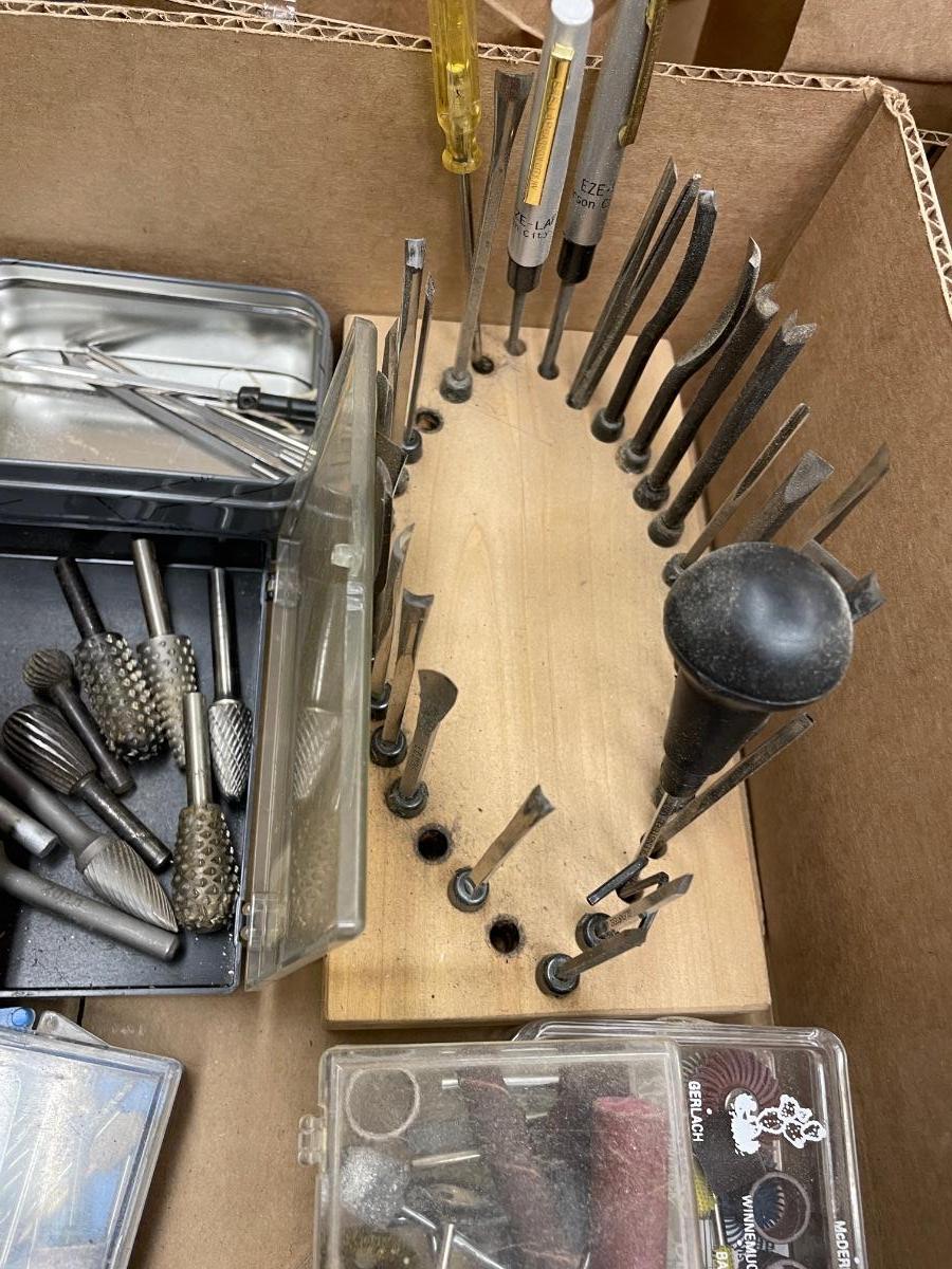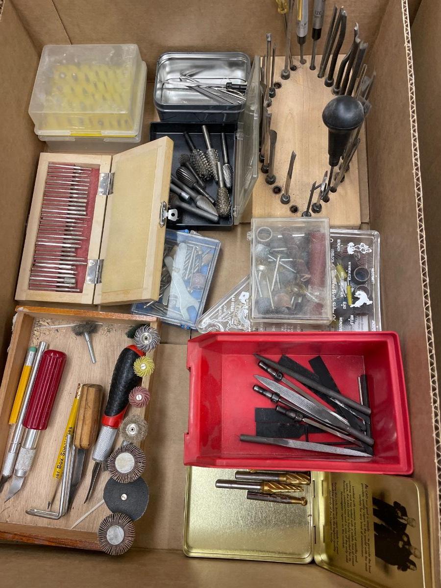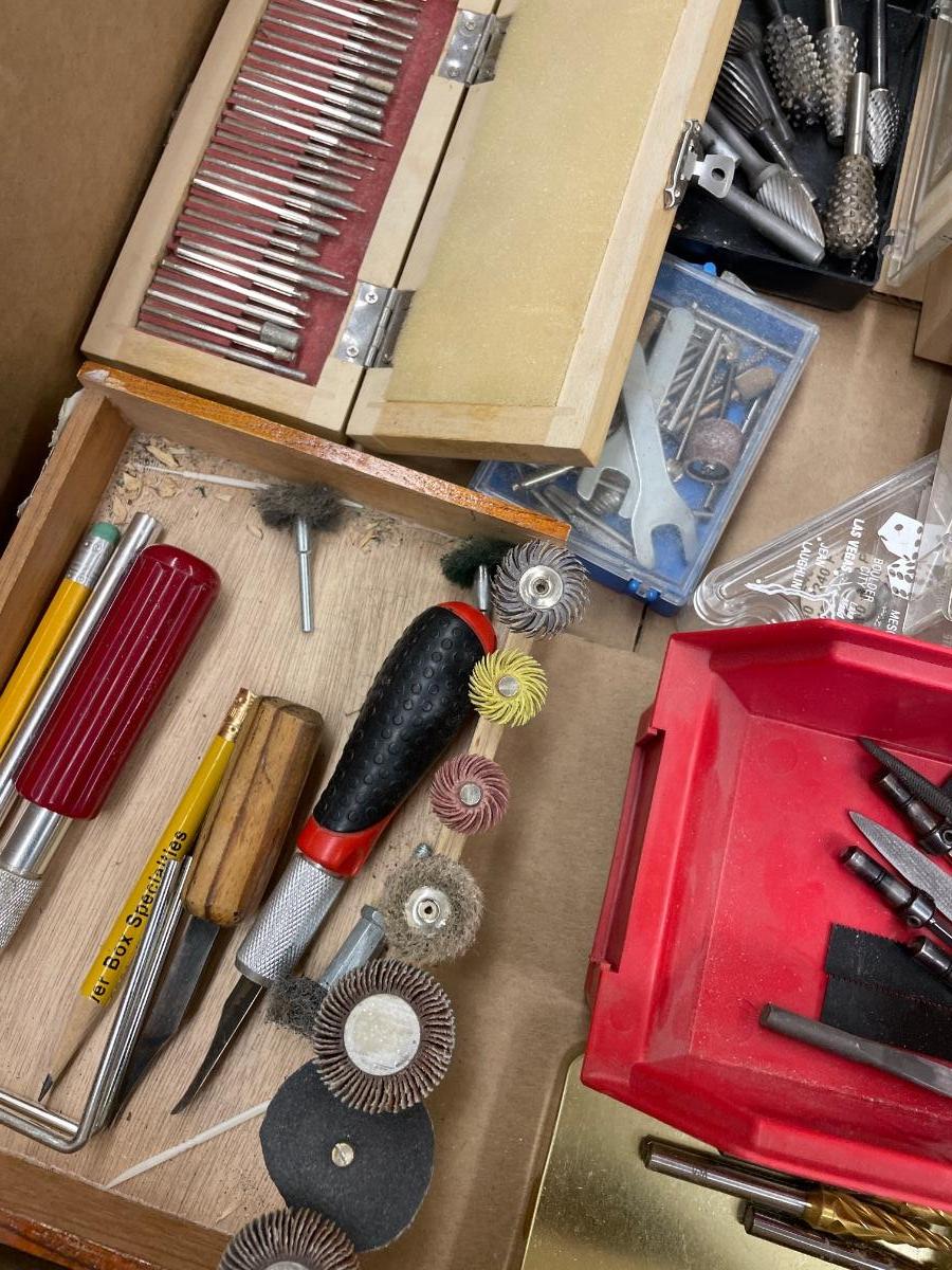 Box of dremmel bits/sm. Woodworking tools