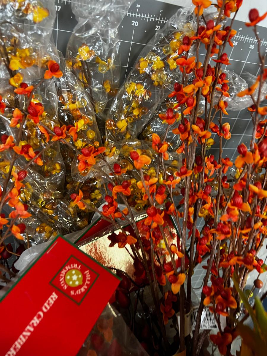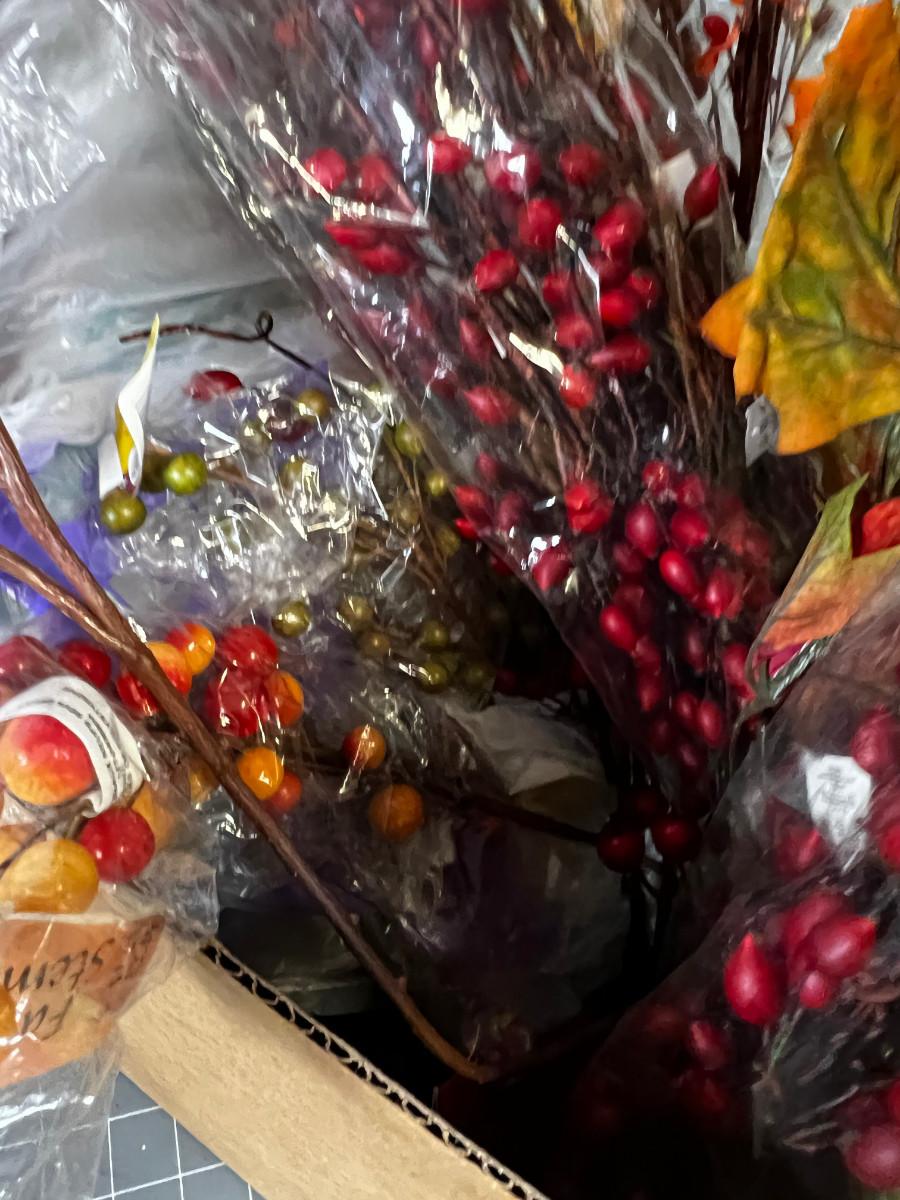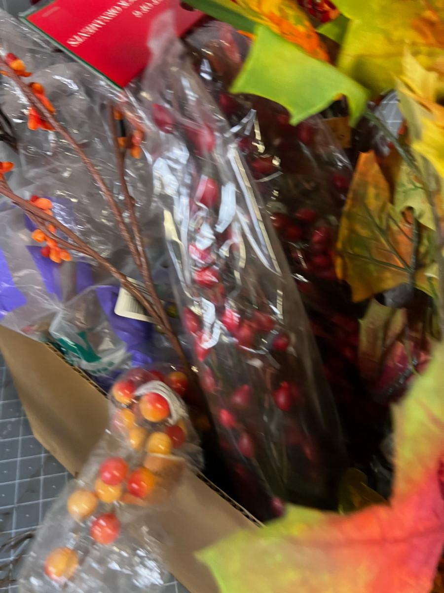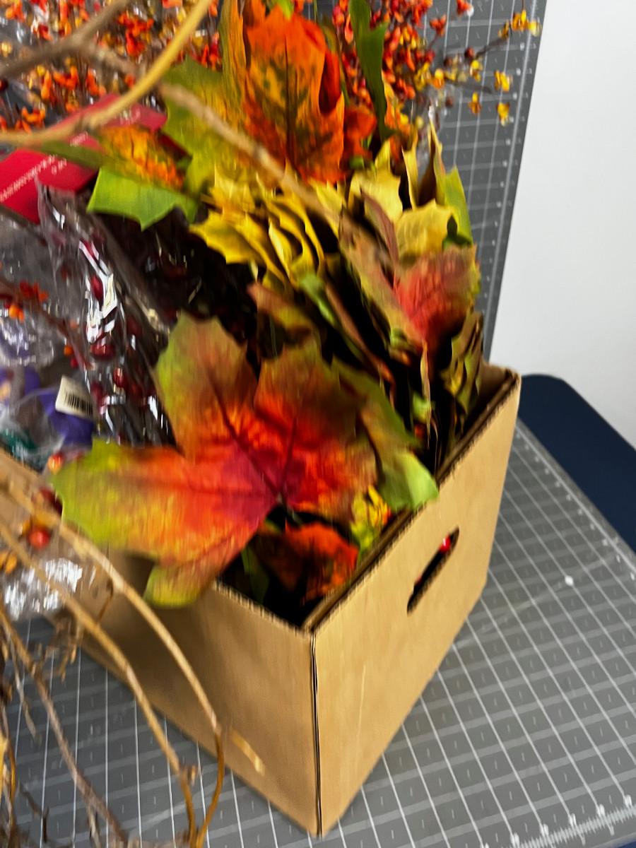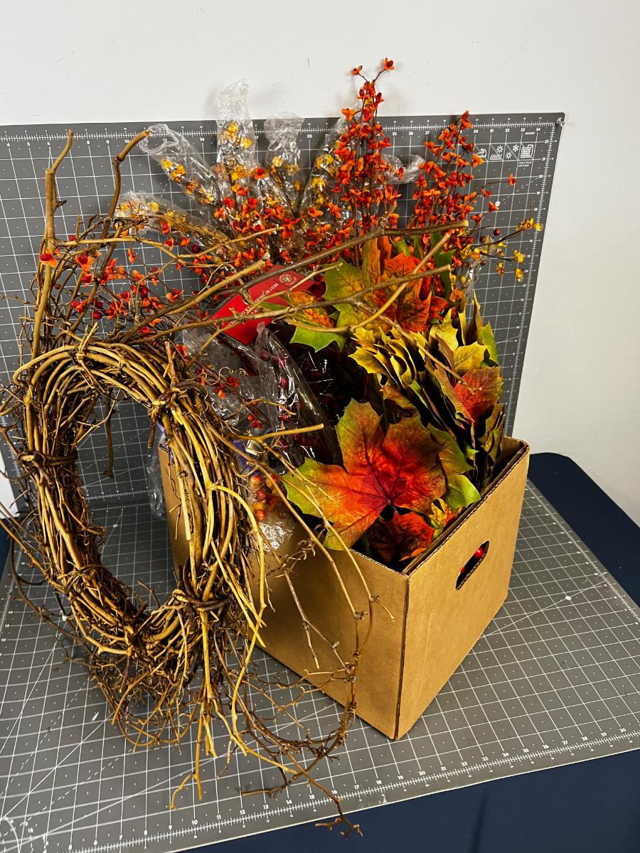 Box of Fall Silk Flowers Orange Tones etc. + Wreath of Twigs