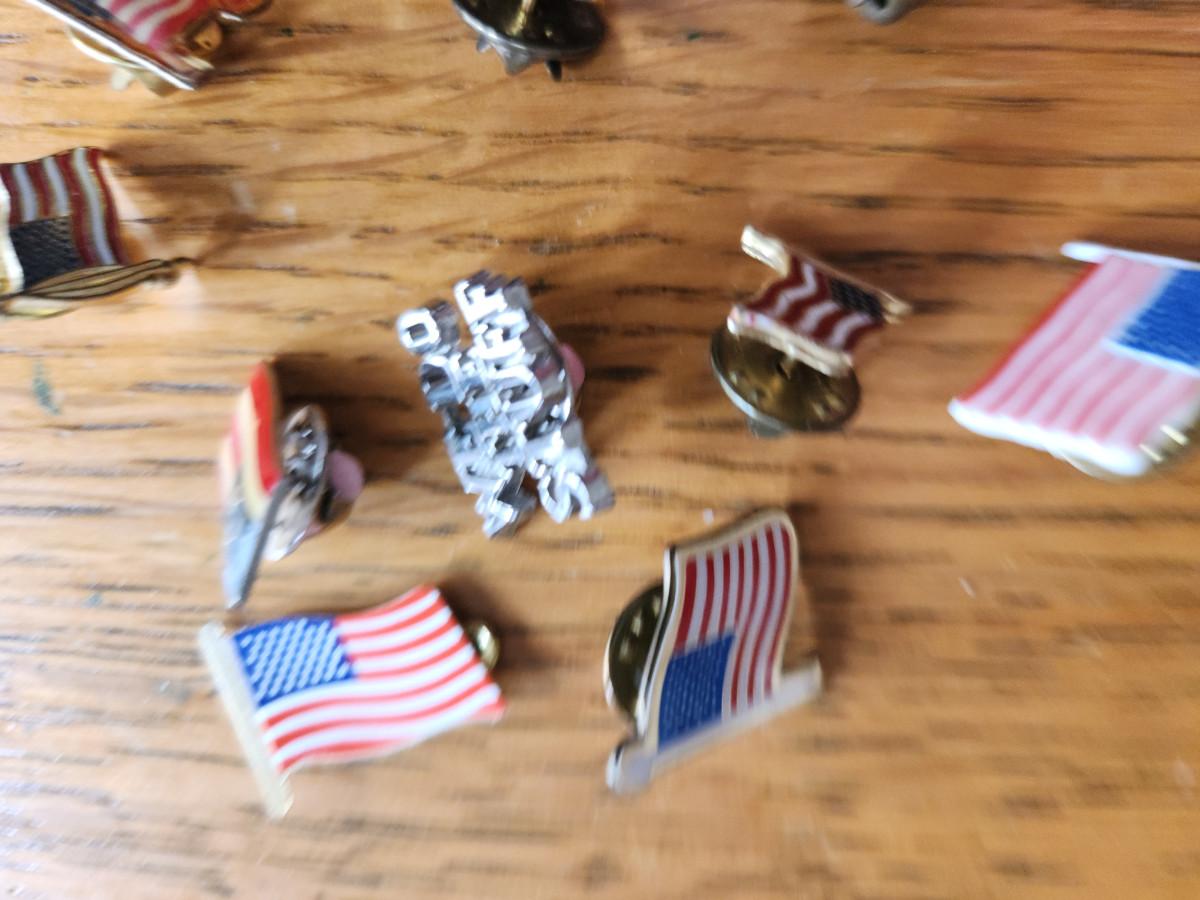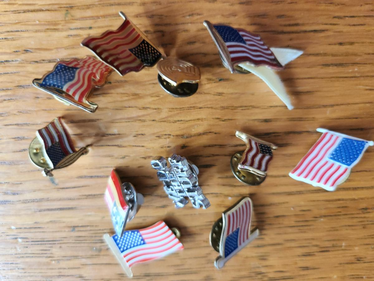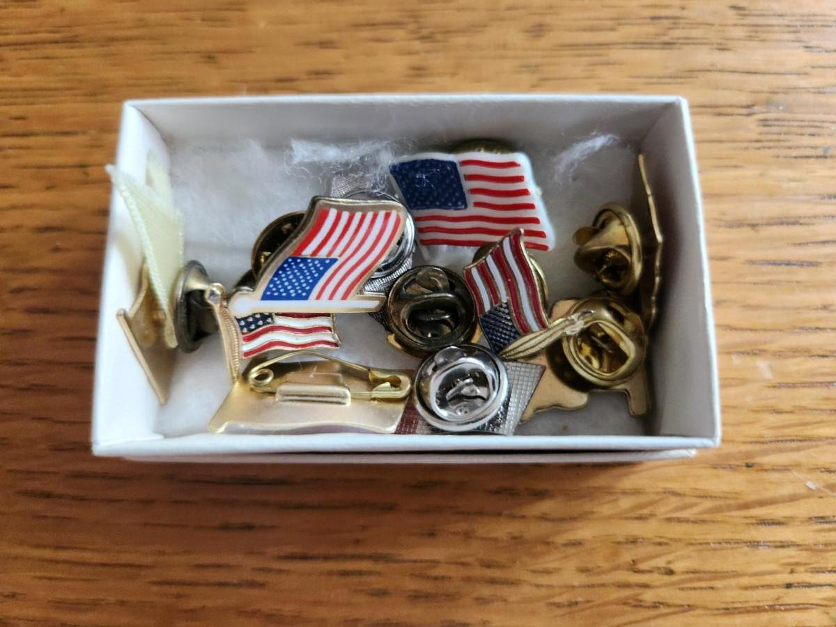 This auction lot is for a small box of USA Flag Pins. Show your pride on every lapel. This collection of 11 pins are diverse and include a couple of non-flag pins just because.