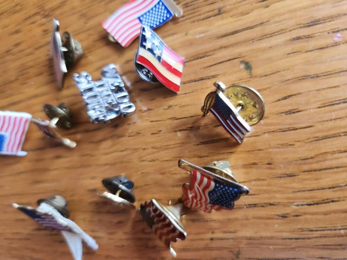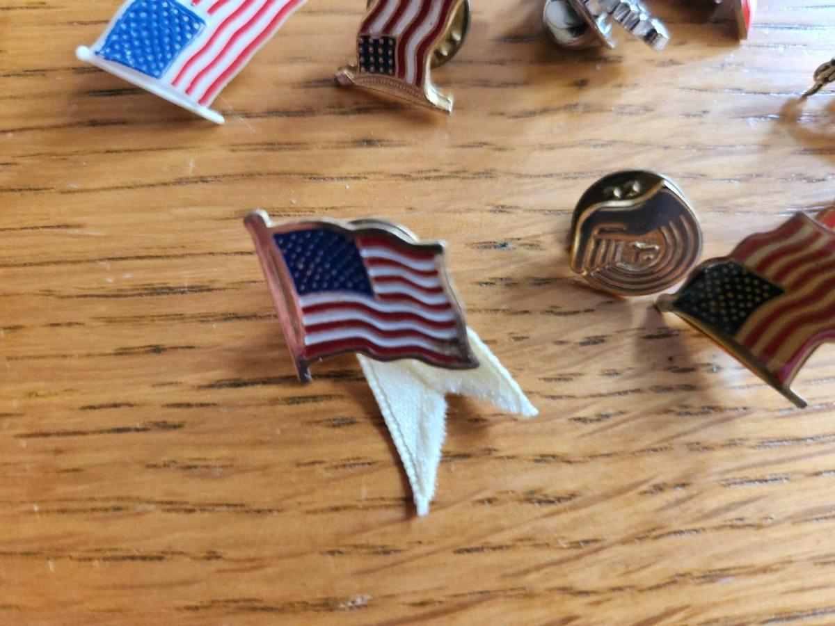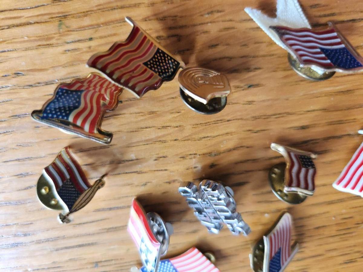 This auction lot is for a small box of USA Flag Pins. Show your pride on every lapel. This collection of 11 pins are diverse and include a couple of non-flag pins just because.
