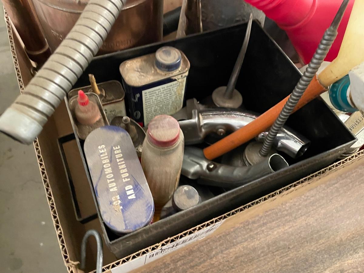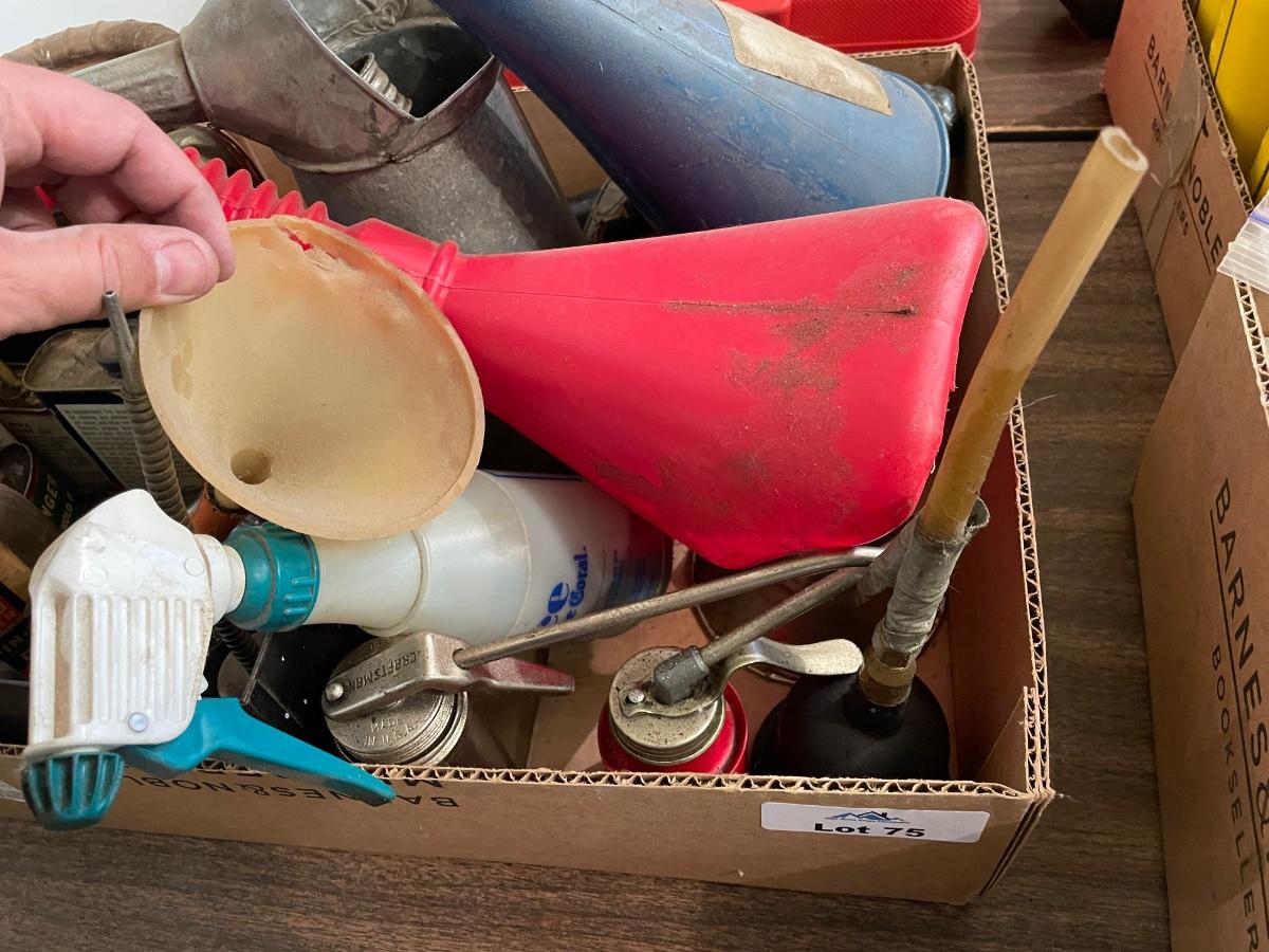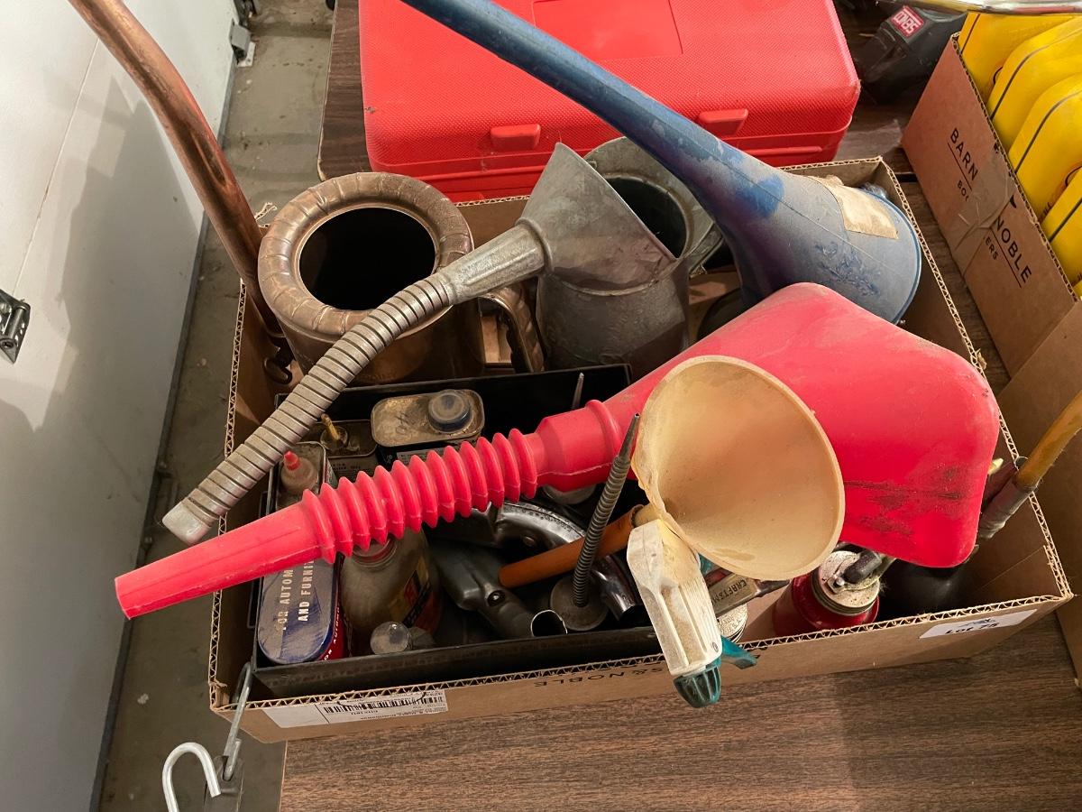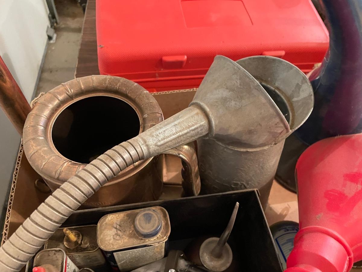 Box of Funnels 2 old vintage metal ones/Oil Spouts & Fluids