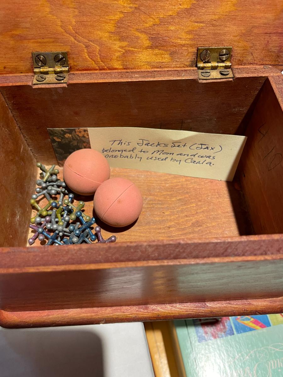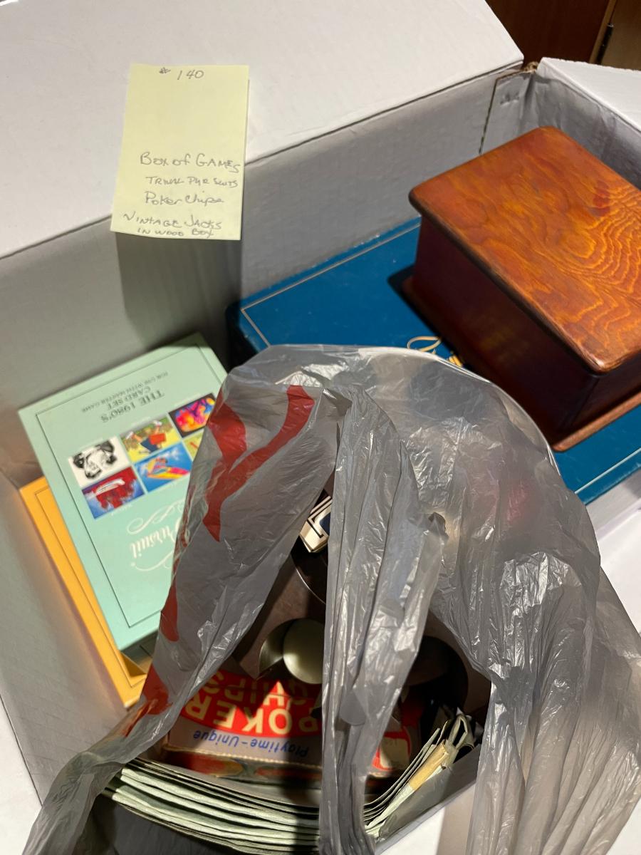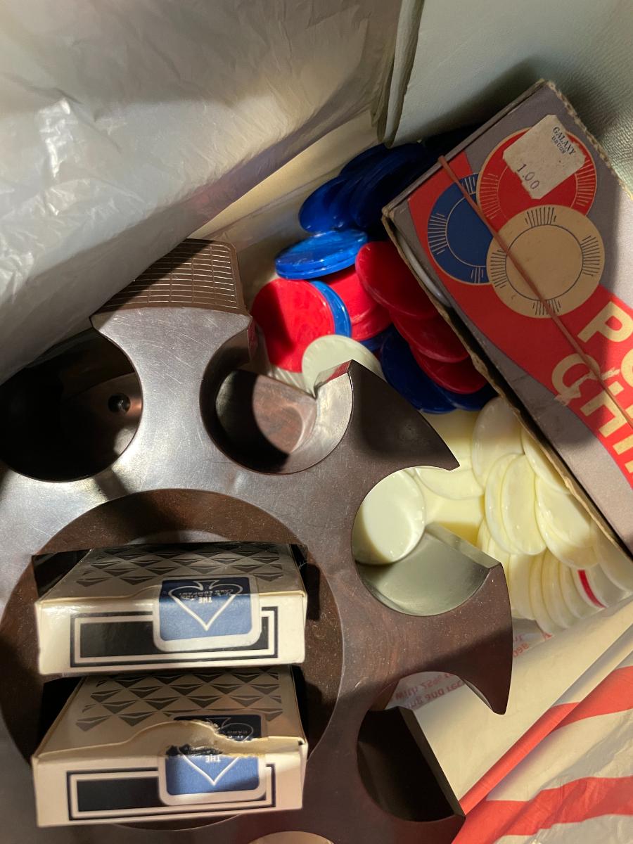 Trival pursuit, cards, poker chips, and Vintage jacks