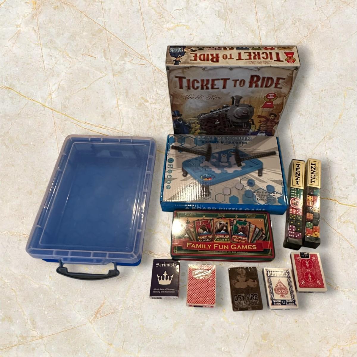 Box of Games, Cards, Dice, Plastic Carry Container
