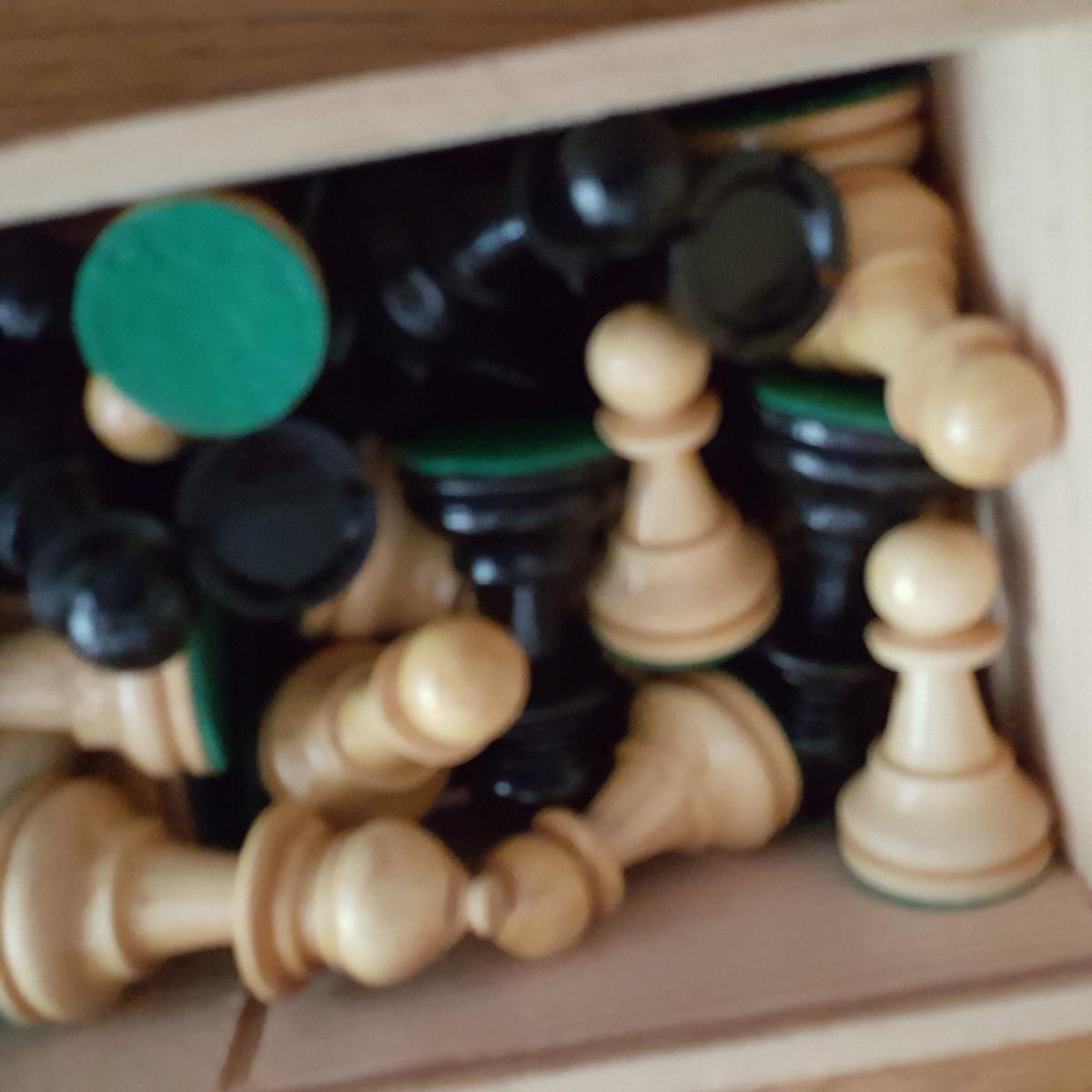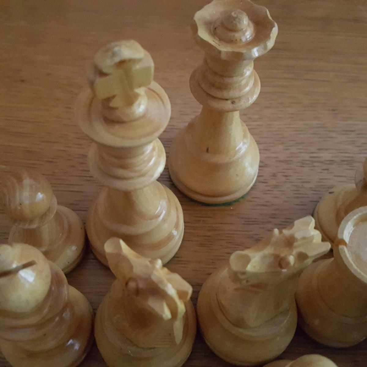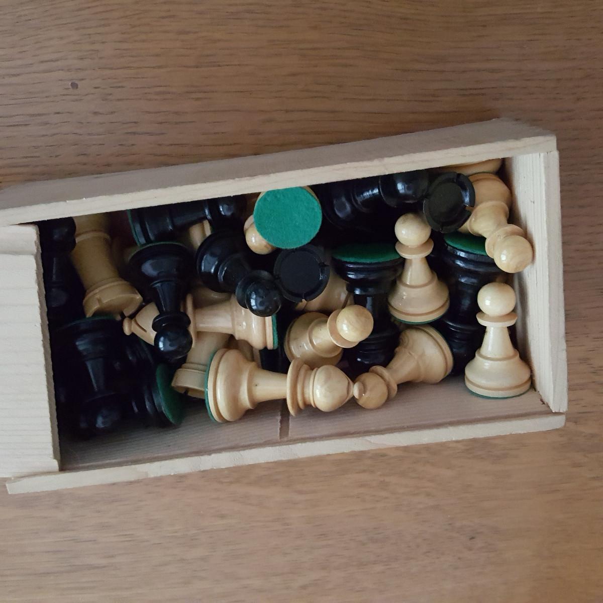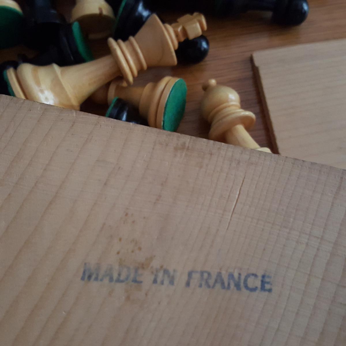 This auction lot is for a Box of Hand Carved Wood Chess Pieces. Complete with all 32 pieces and in a fun wood box that is marked made in France. The box measures about 3 X 4 X 8-inches. All the chess pieces appear to be in very good condition and have green felt attached to the base. Checkmate! on this beautiful set.