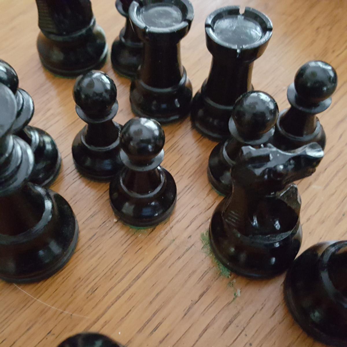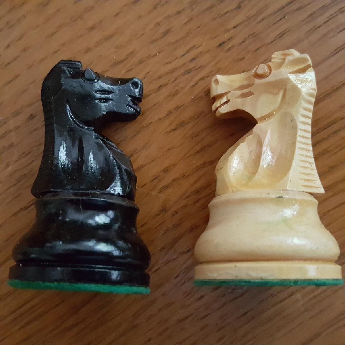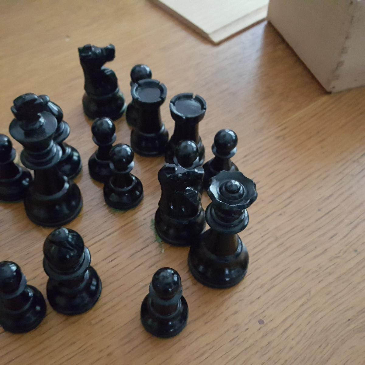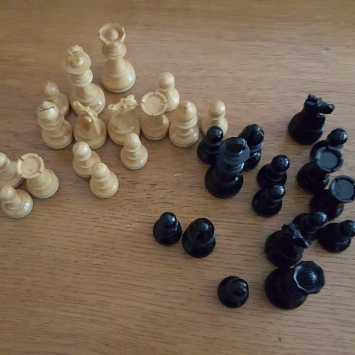 This auction lot is for a Box of Hand Carved Wood Chess Pieces. Complete with all 32 pieces and in a fun wood box that is marked made in France. The box measures about 3 X 4 X 8-inches. All the chess pieces appear to be in very good condition and have green felt attached to the base. Checkmate! on this beautiful set.