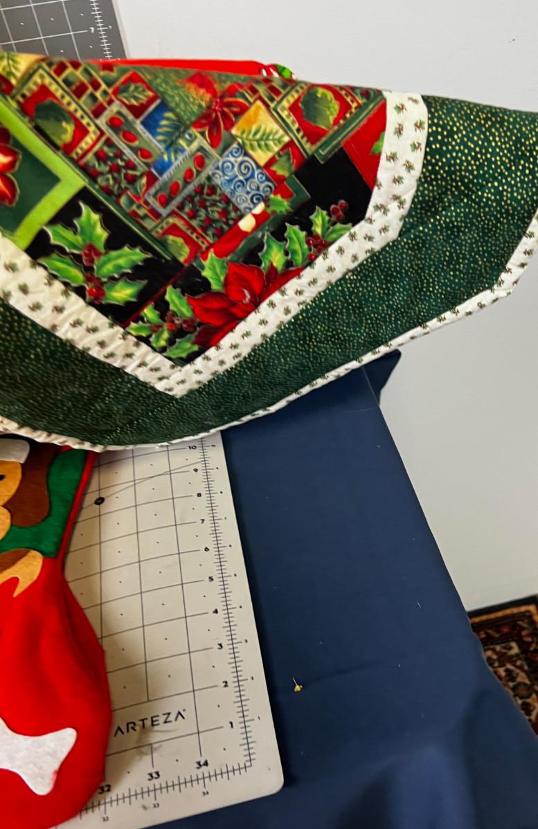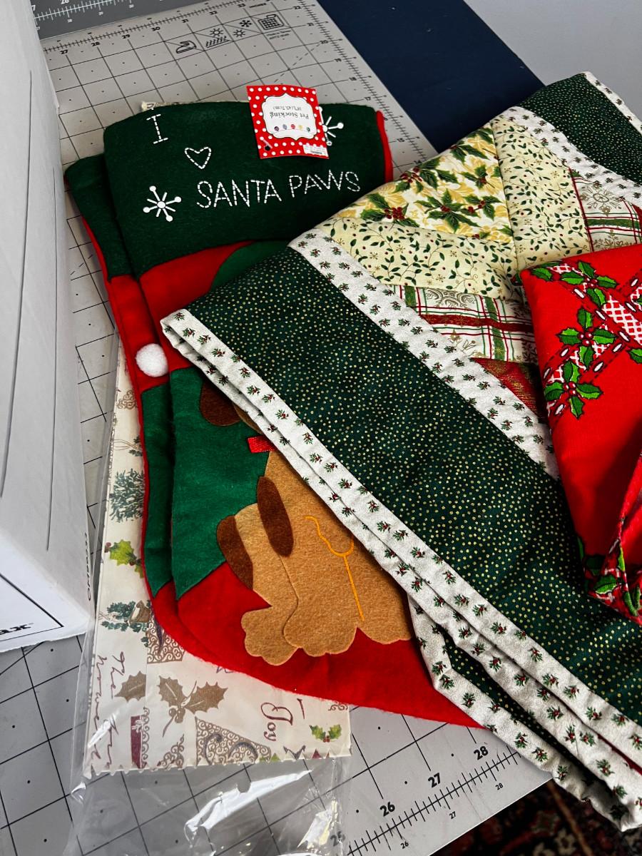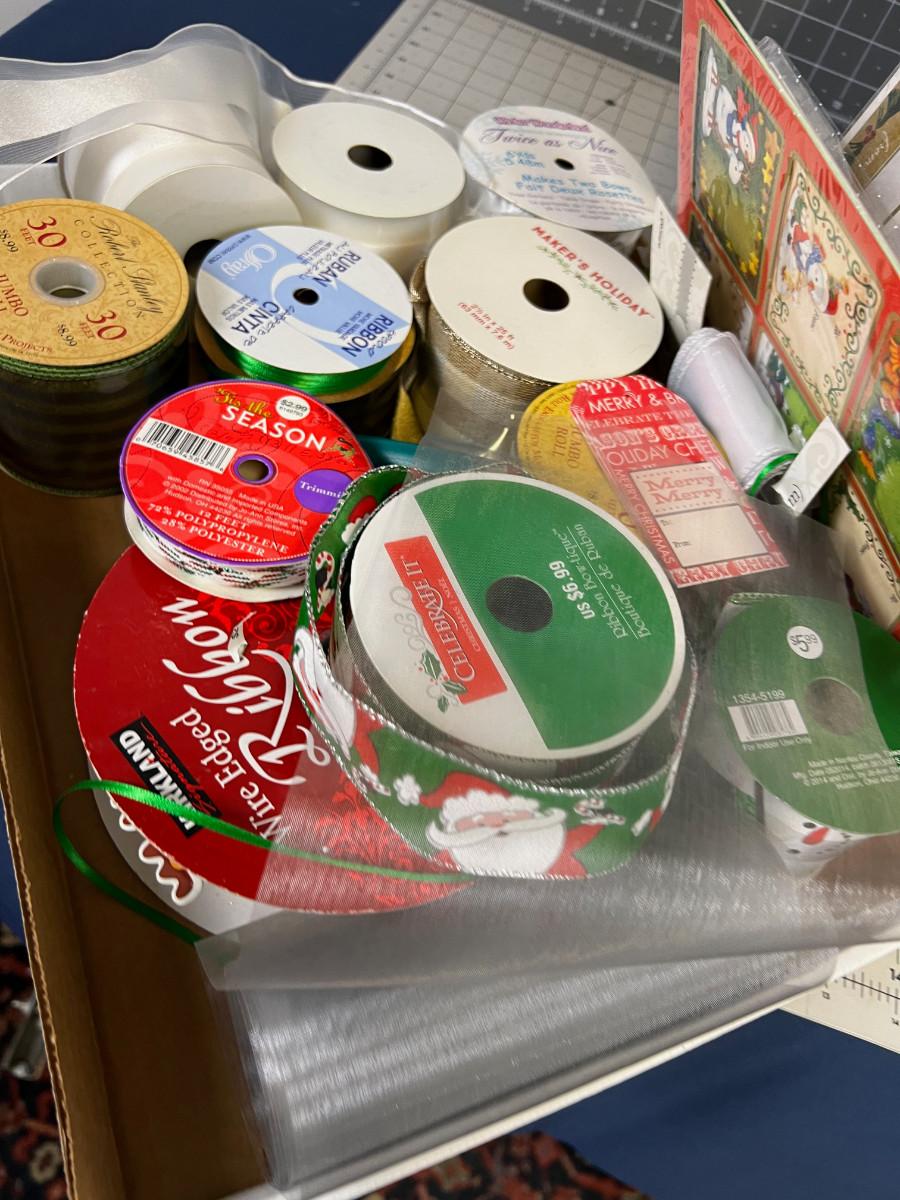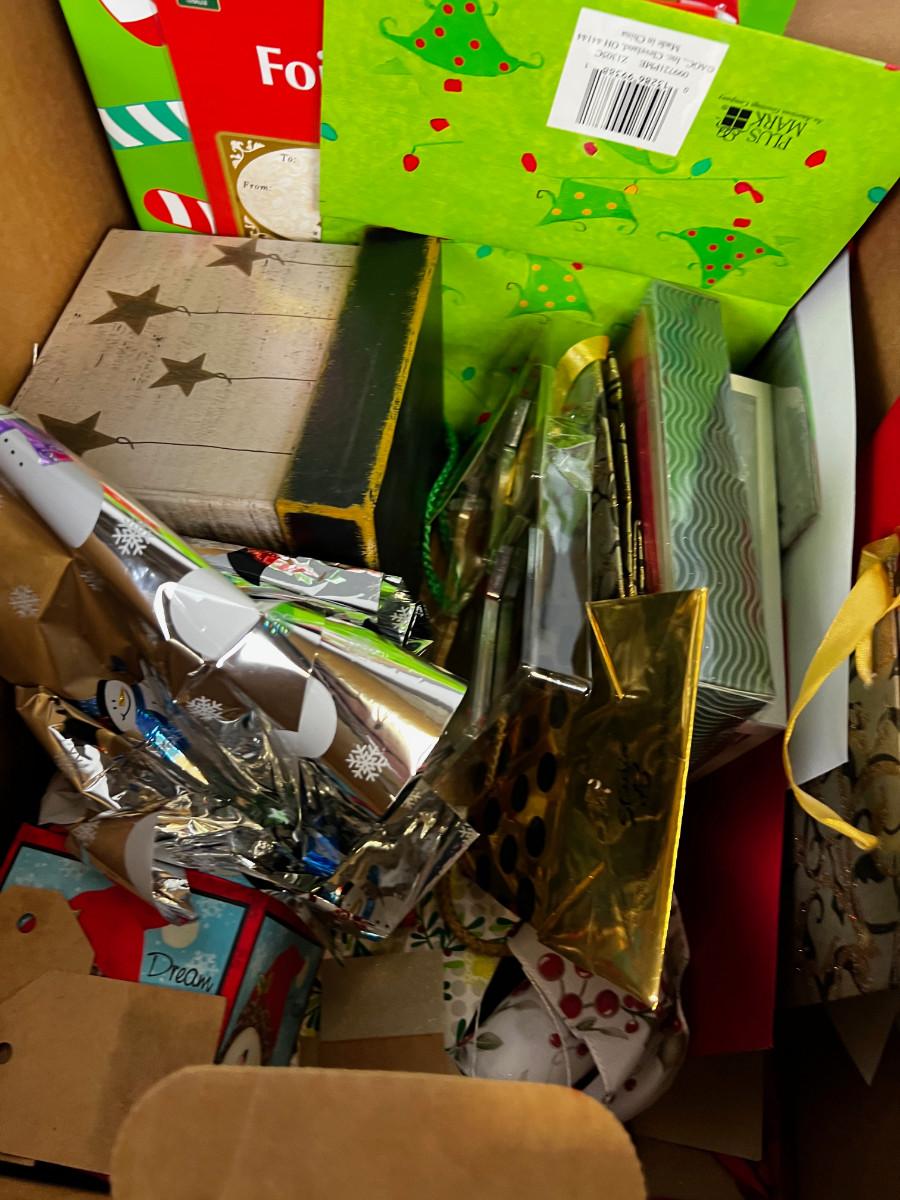 Box of Holiday Items: Wrap, linens, Cards, Stocking