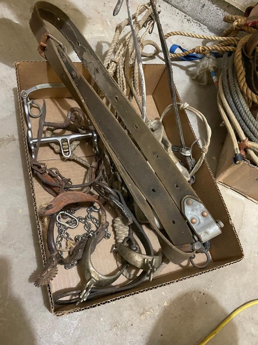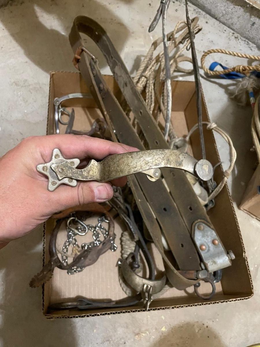 Box of Horse tack - 3 Spurs/Reins/Bridle