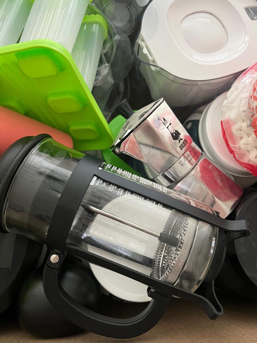 Coffee stuff, protein powders, water jug, cups, veggie bullet, etc