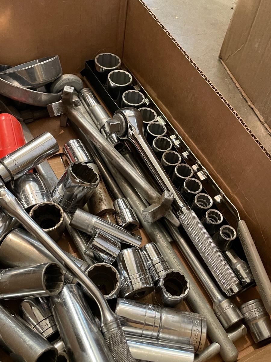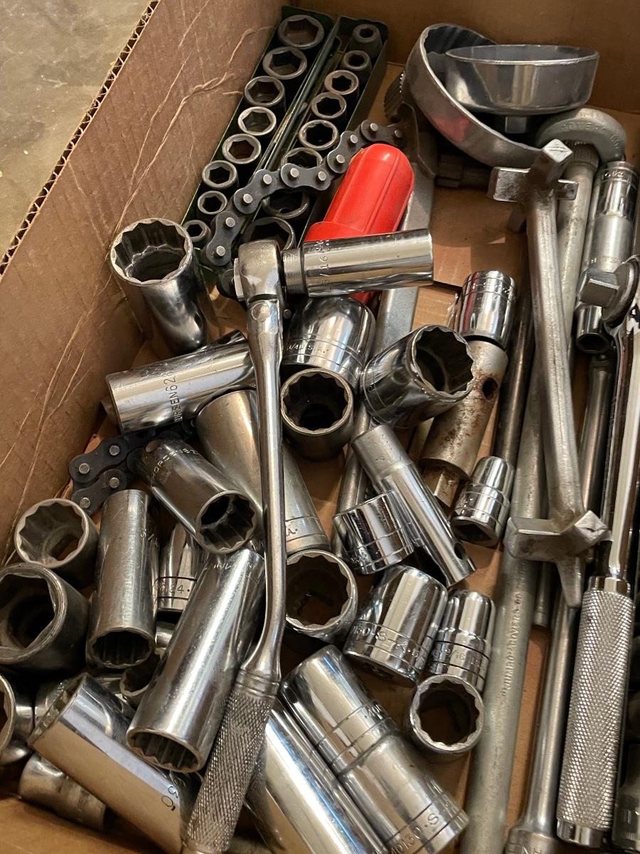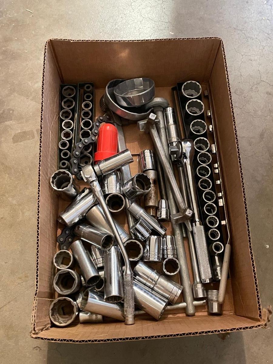 Box of socket wrenches & regular & oversize sockets - Dozens