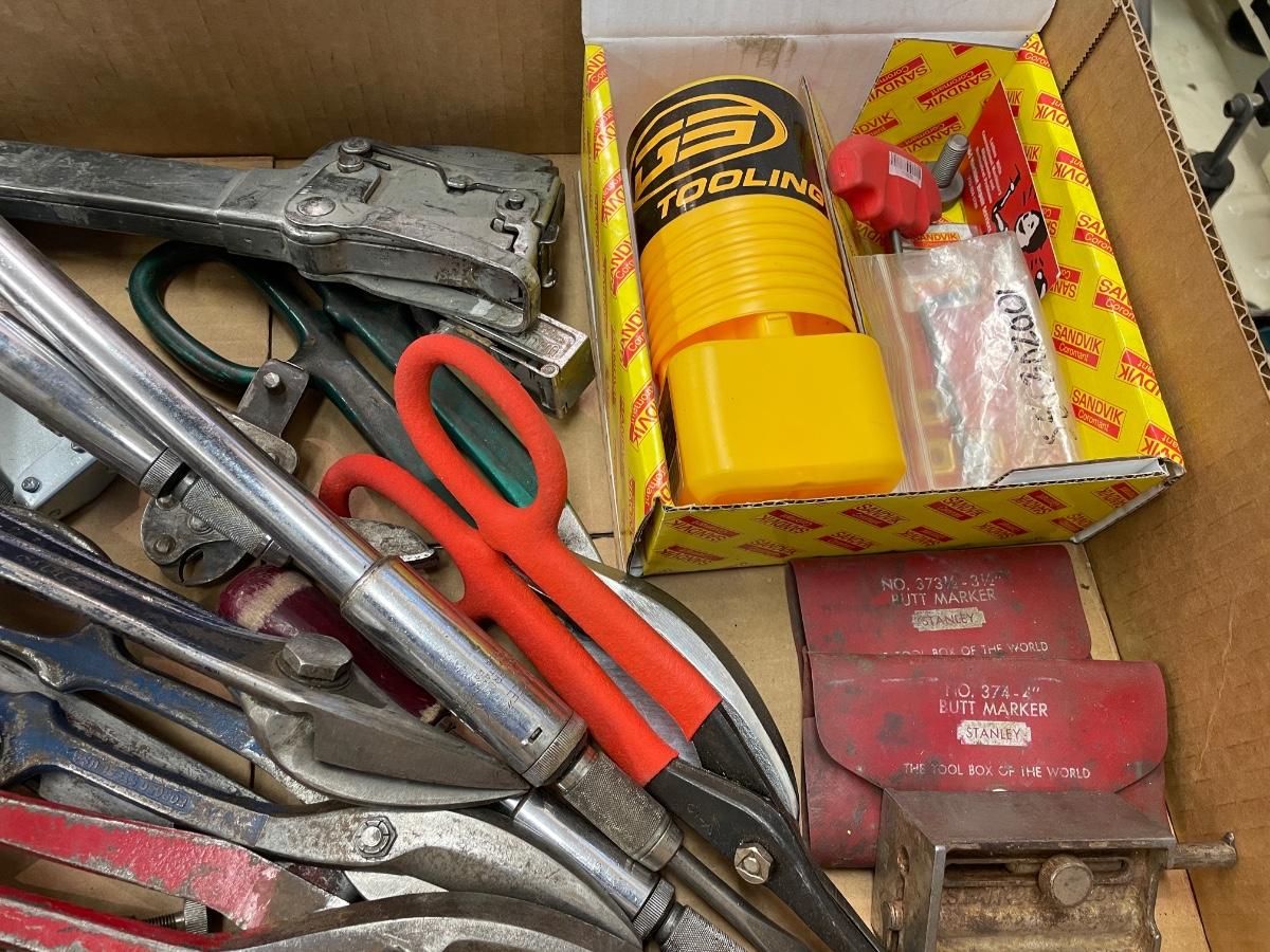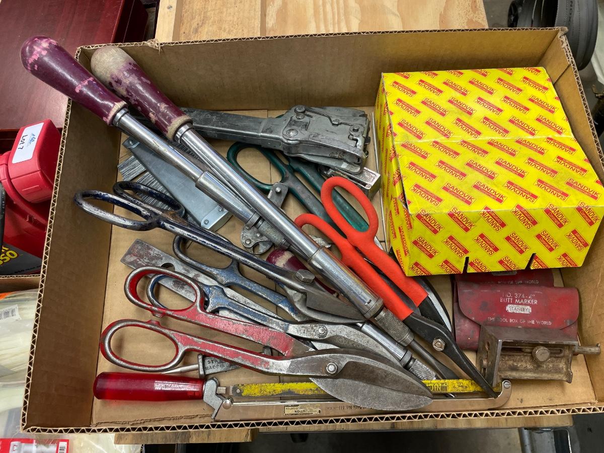 Box of misc. hand tools - hammer stapler/cutting sheers & more