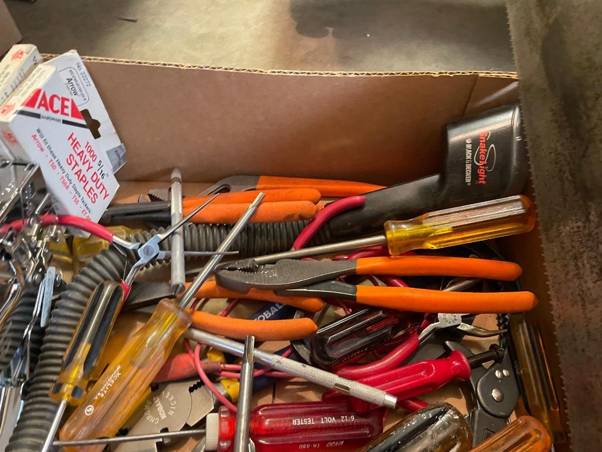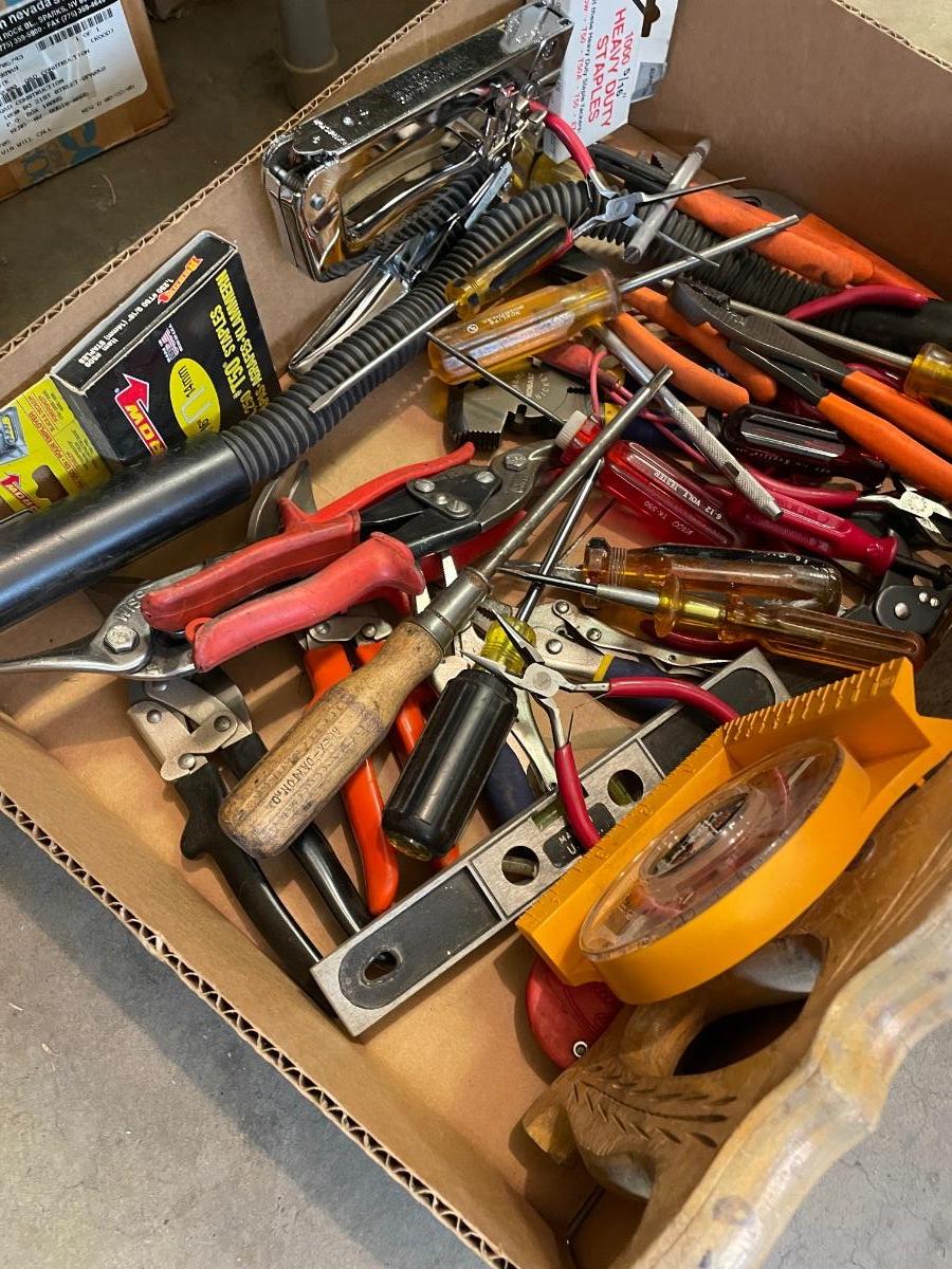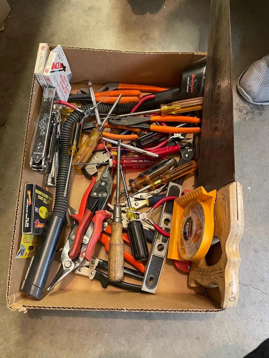 Box of misc. hand tools-pliers/hand saw/flex flashlight/level/tin snips & more