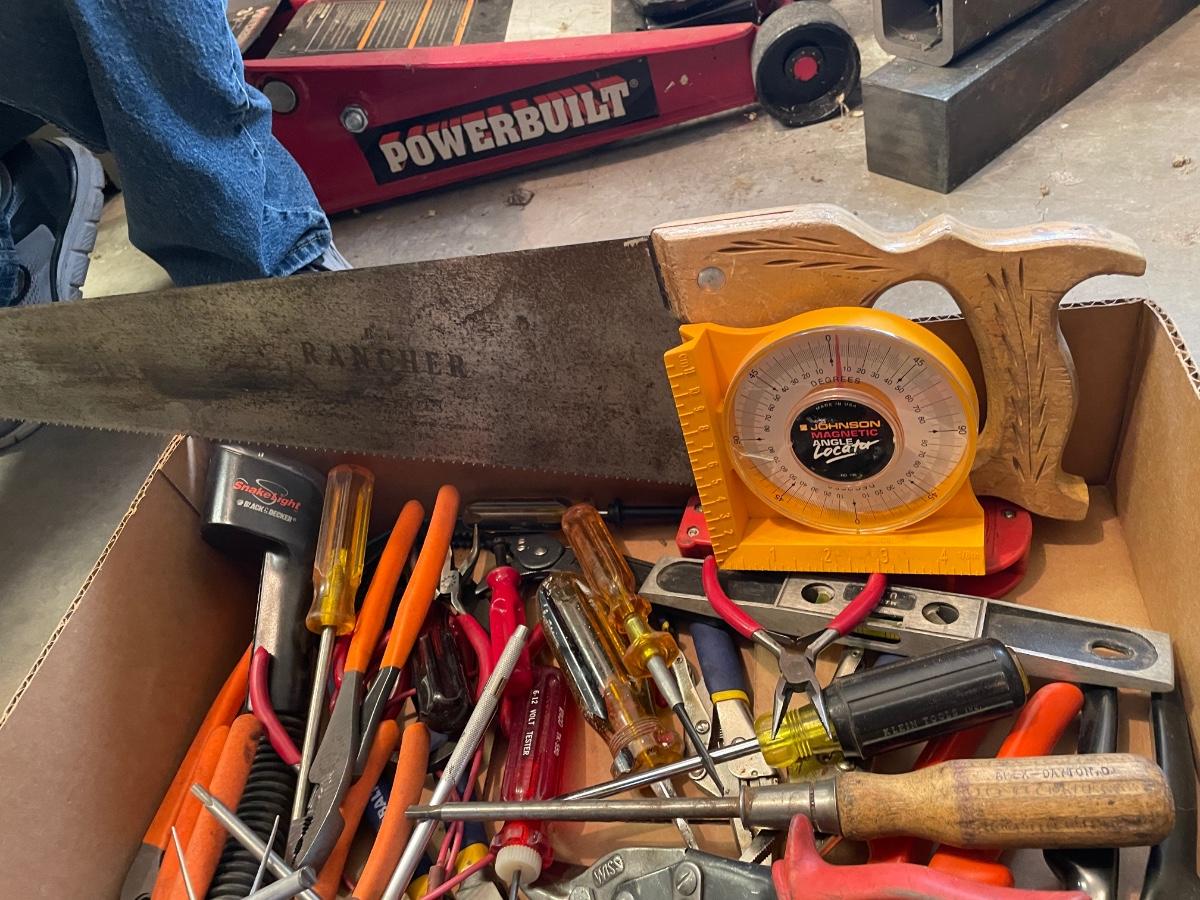 over 2 dozen hand tools as shown in flat box are included in this lot