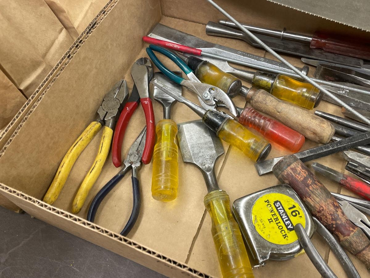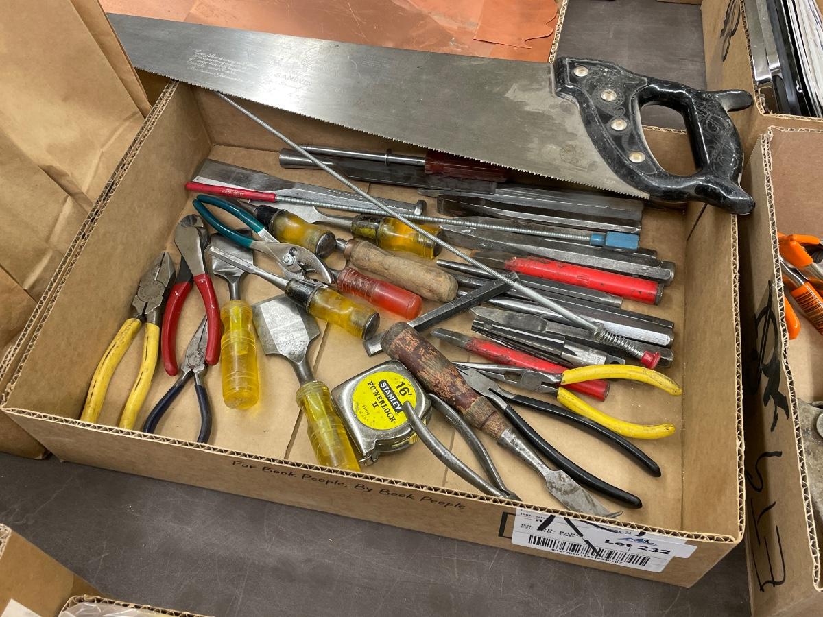 Box of about 30 misc. hand tools - Saw/Chisels/screwdriver/tape