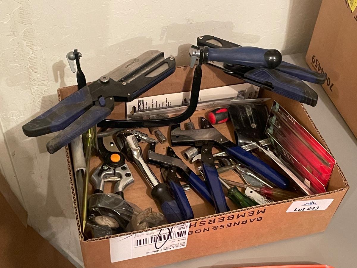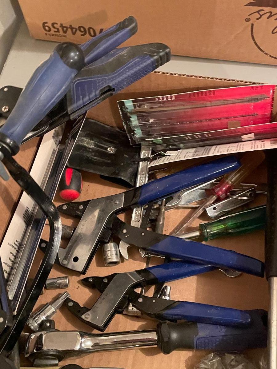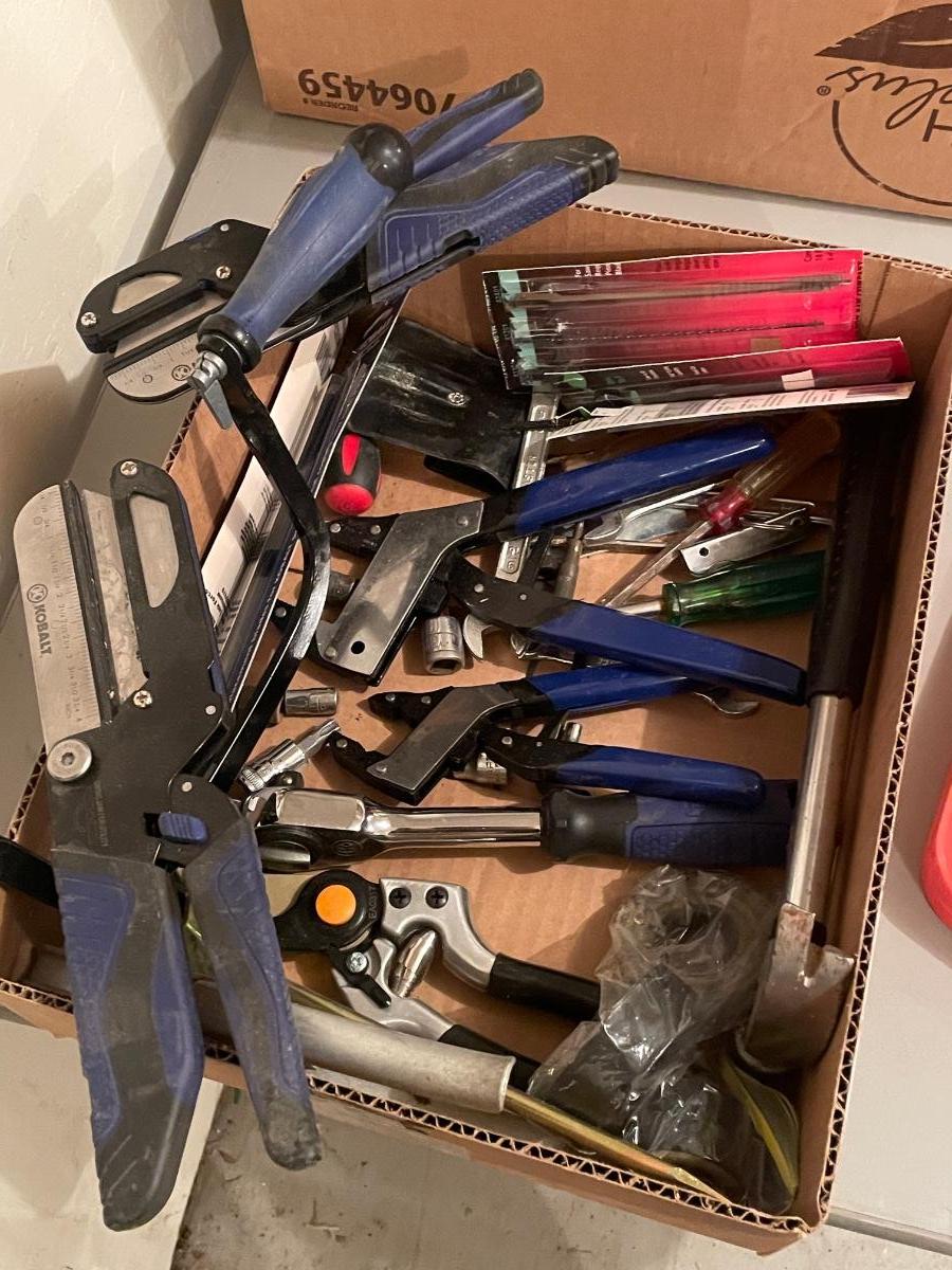 pliers and cutters/blades - lot of Kobalt blue handled ones/socket wrench & sockets, hacksaw, screwdrivers and more