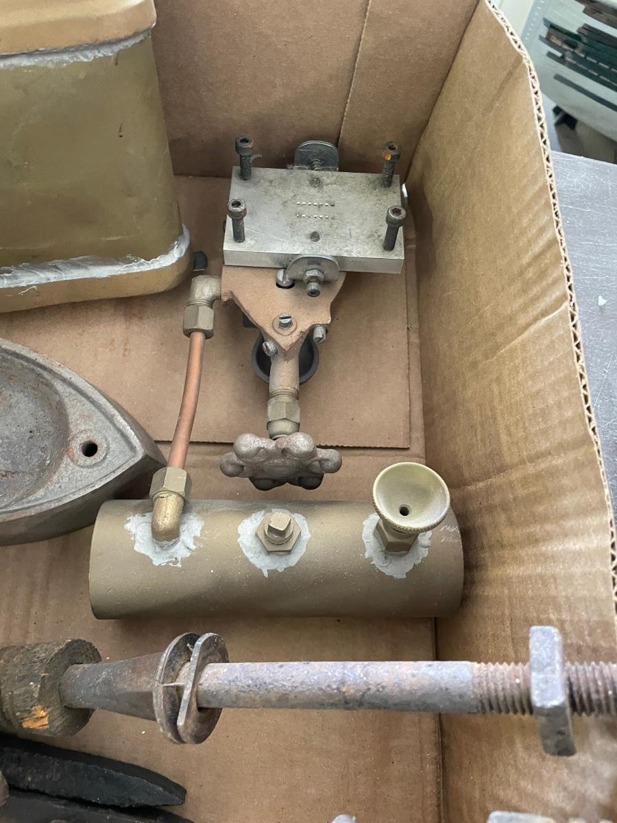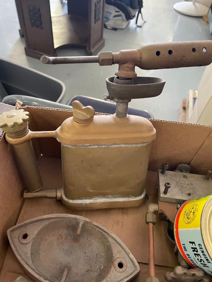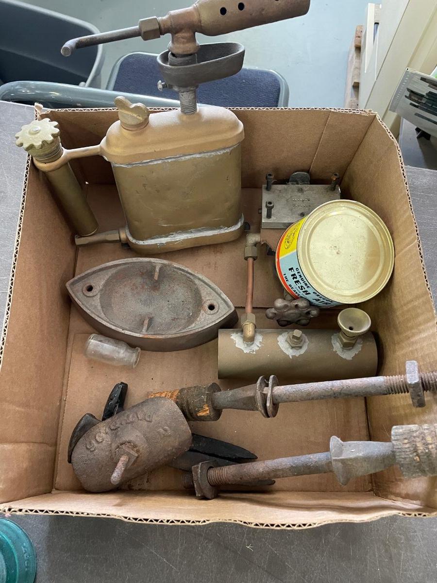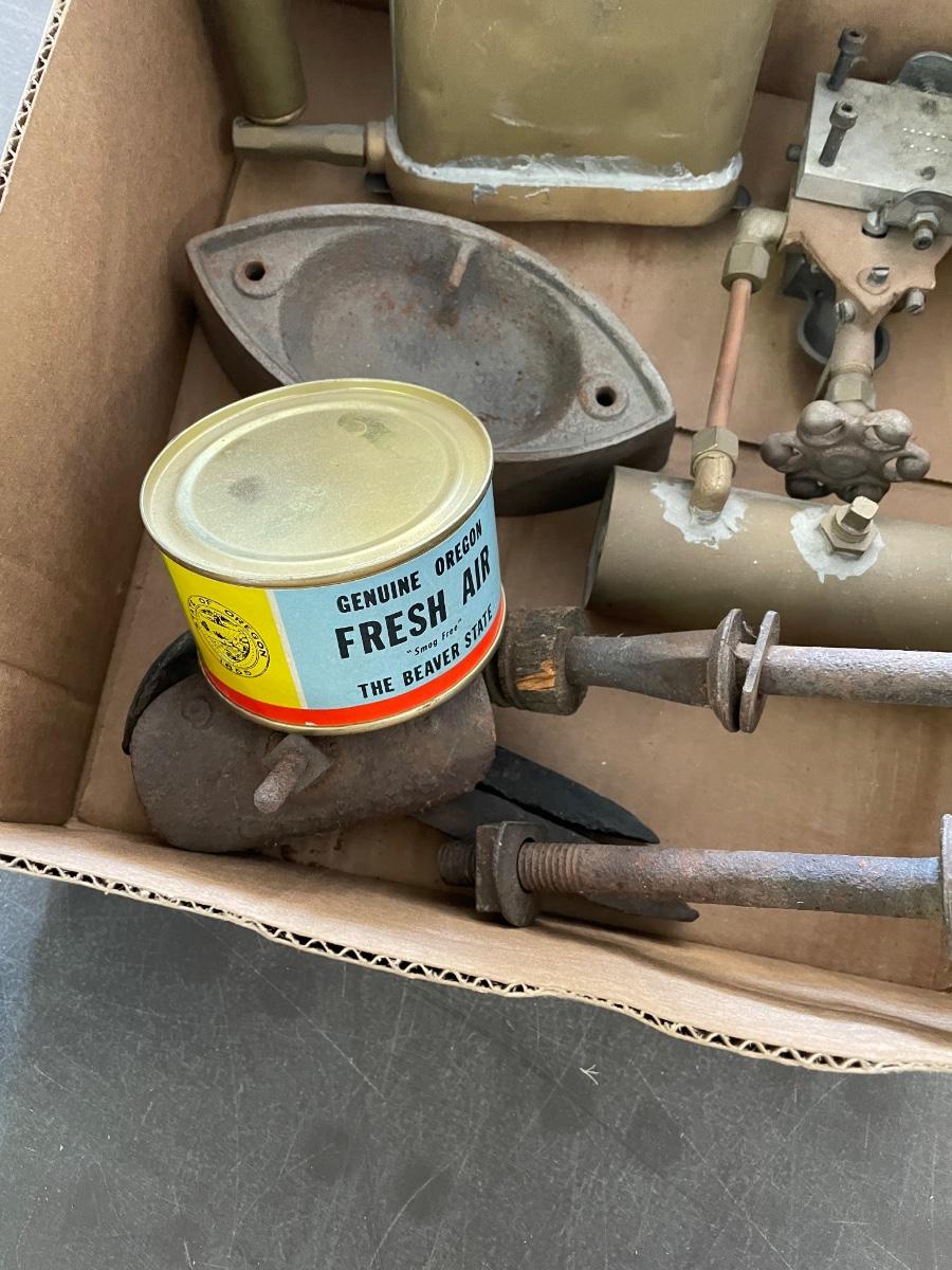 Box of Misc. Metal Antique Parts - Valve - oil torch - Sad Iron