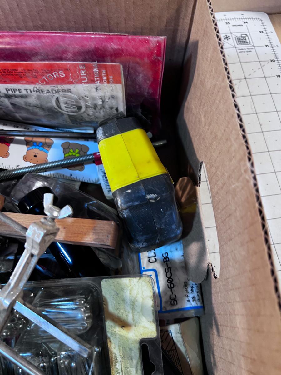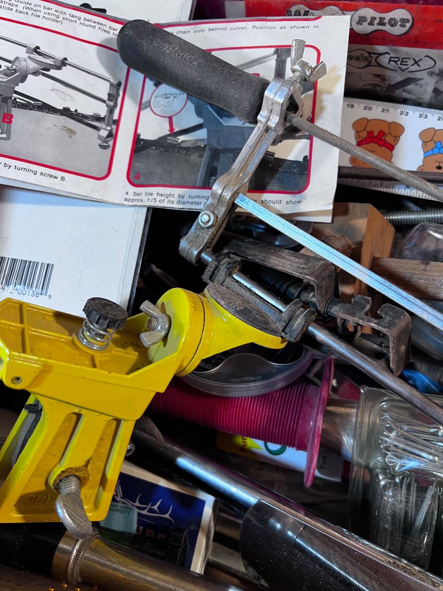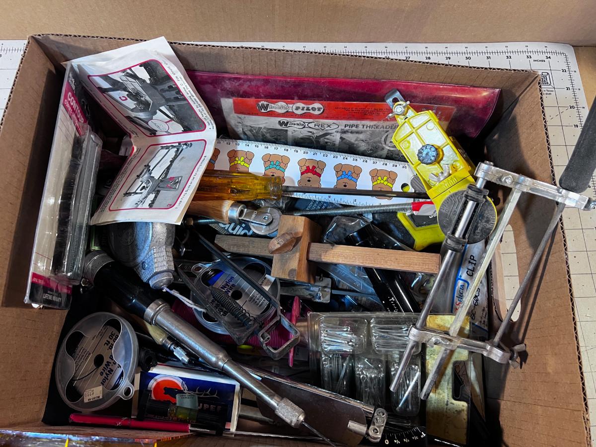 Box of Misc. Tools: Chain Saw Sharpener, Tape Measures, etc.