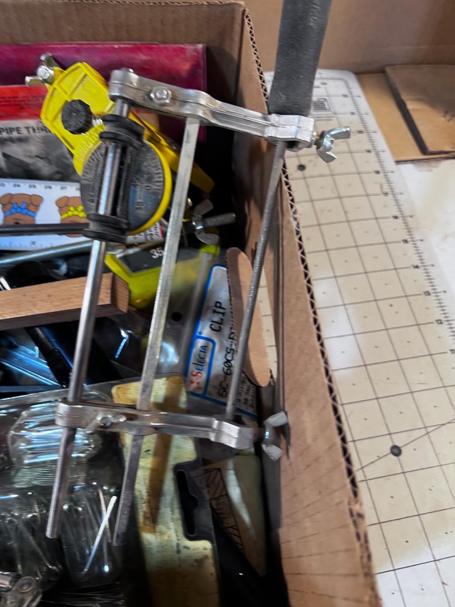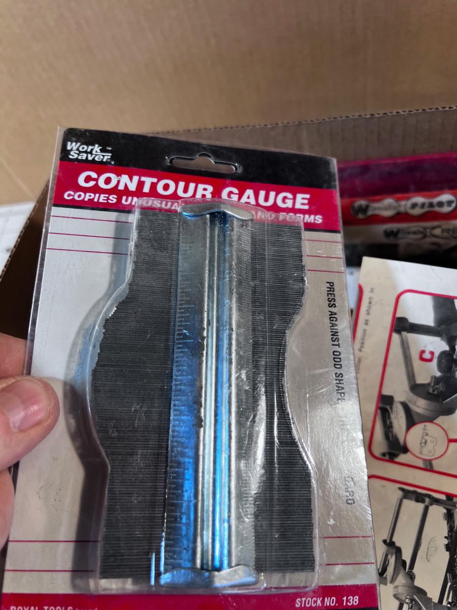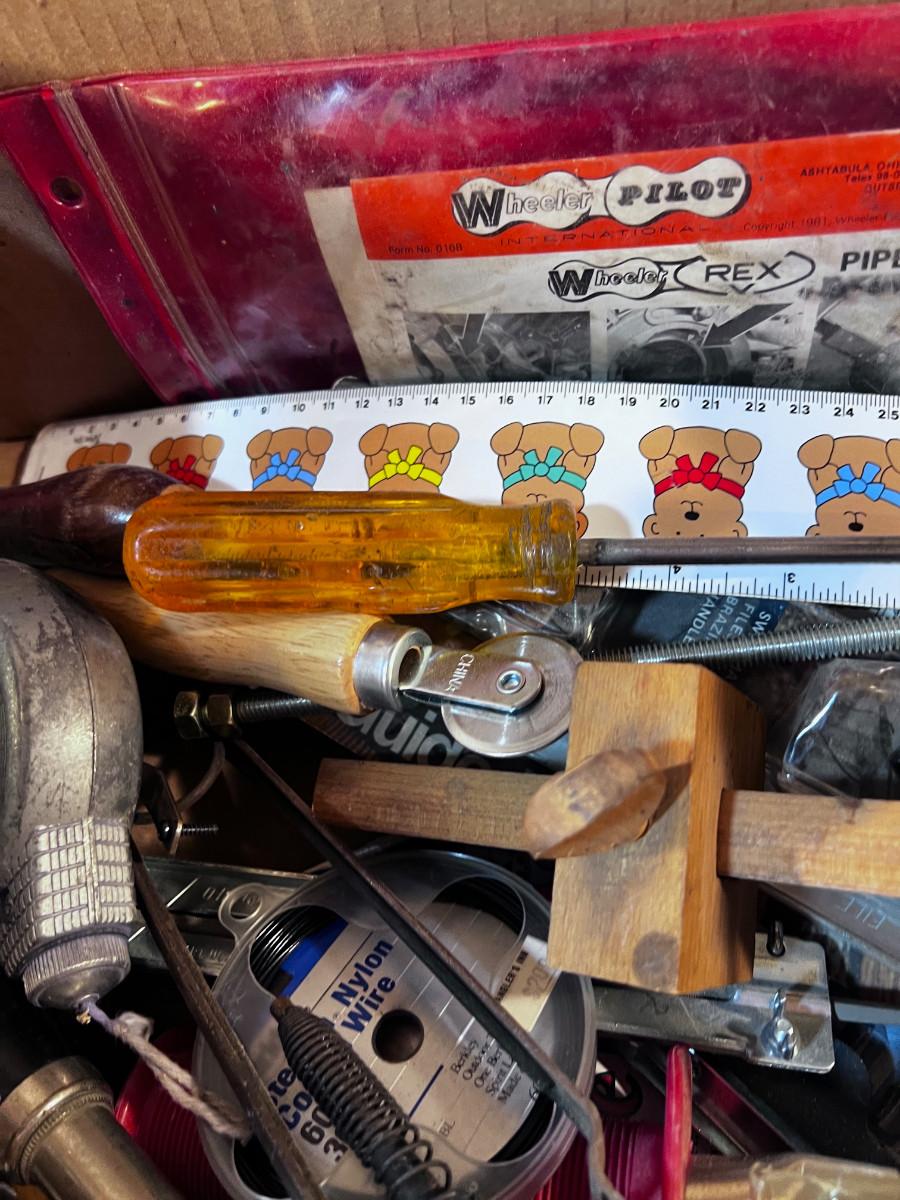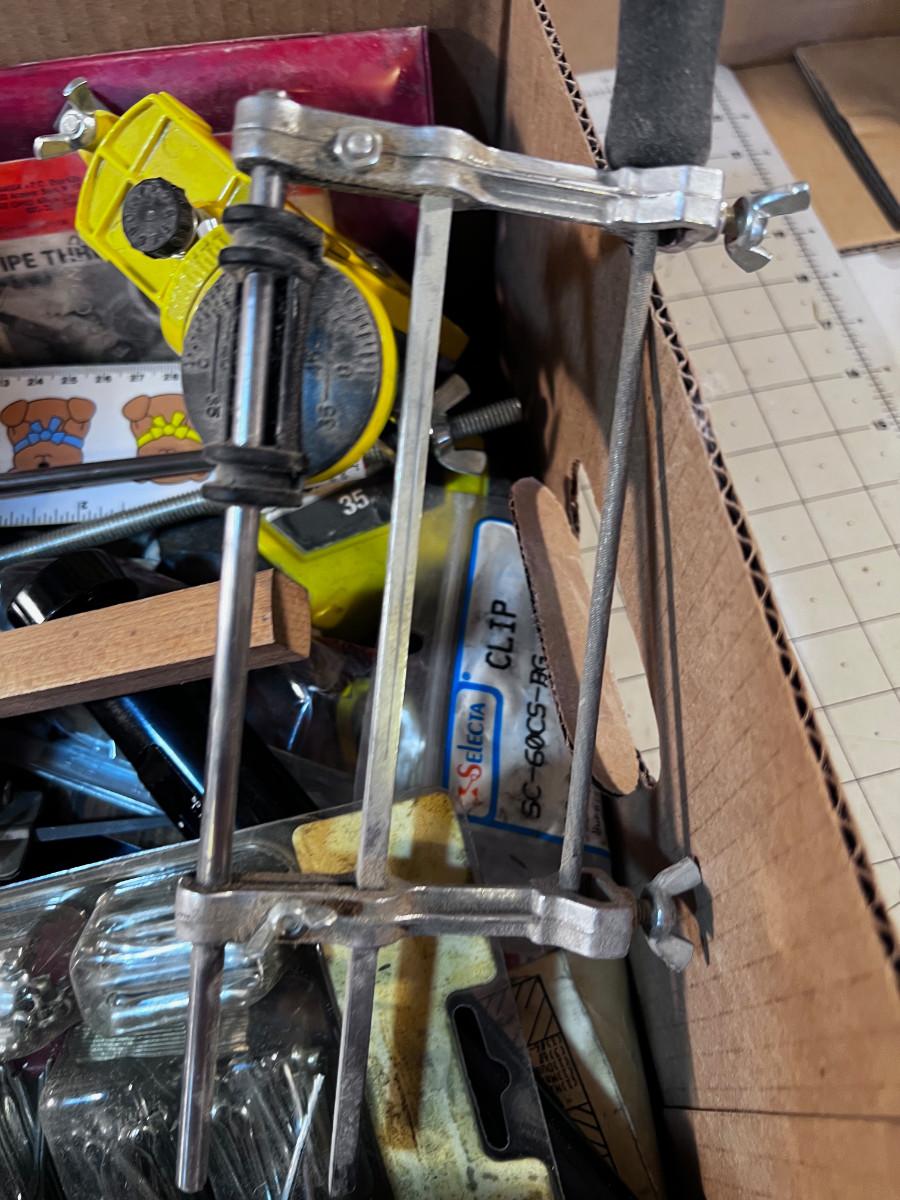 Box of Misc. Tools: Chain Saw Sharpener, Tape Measures, etc.