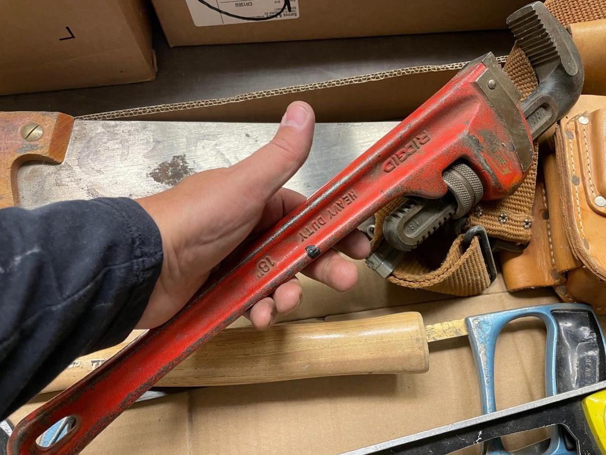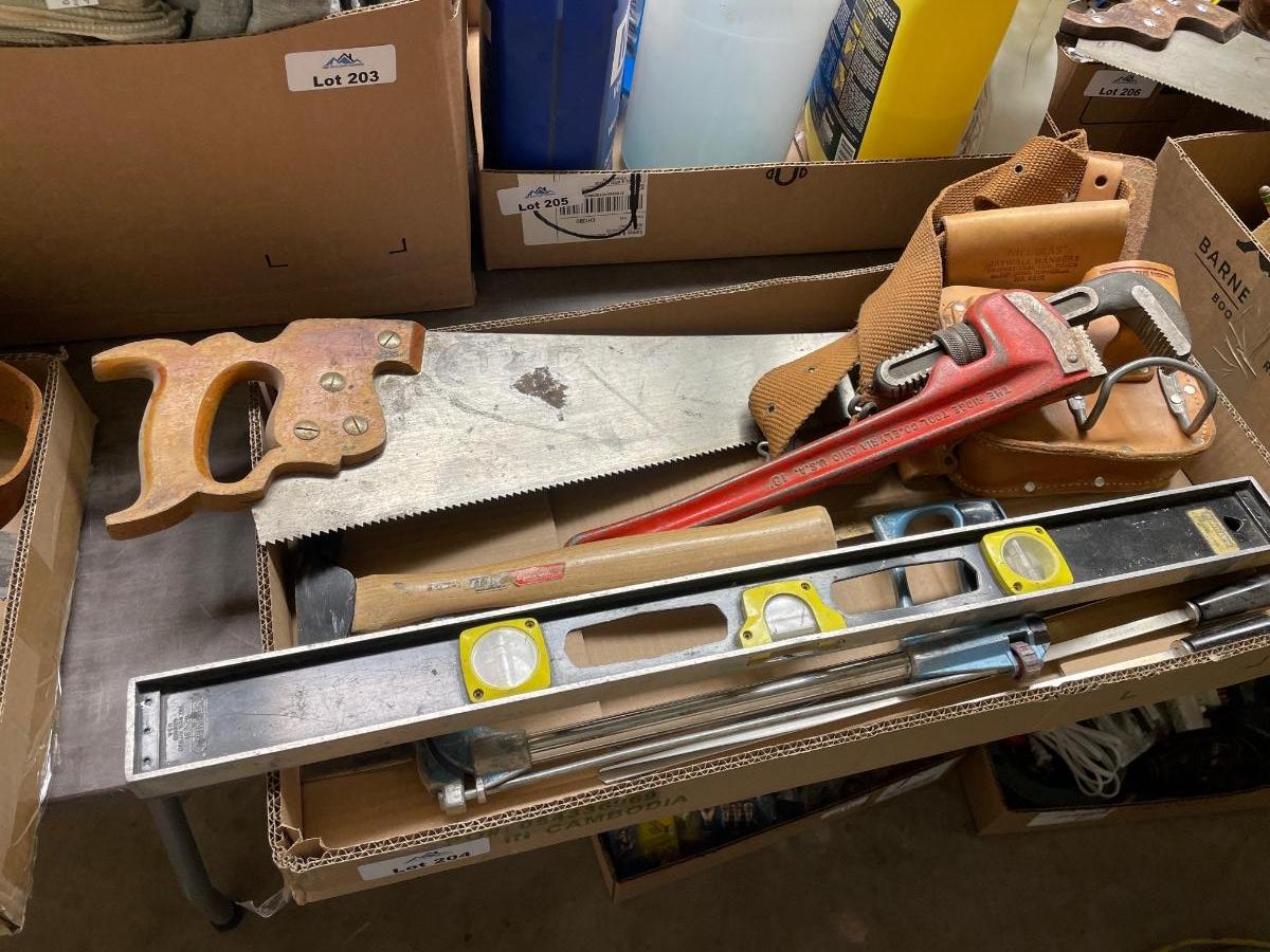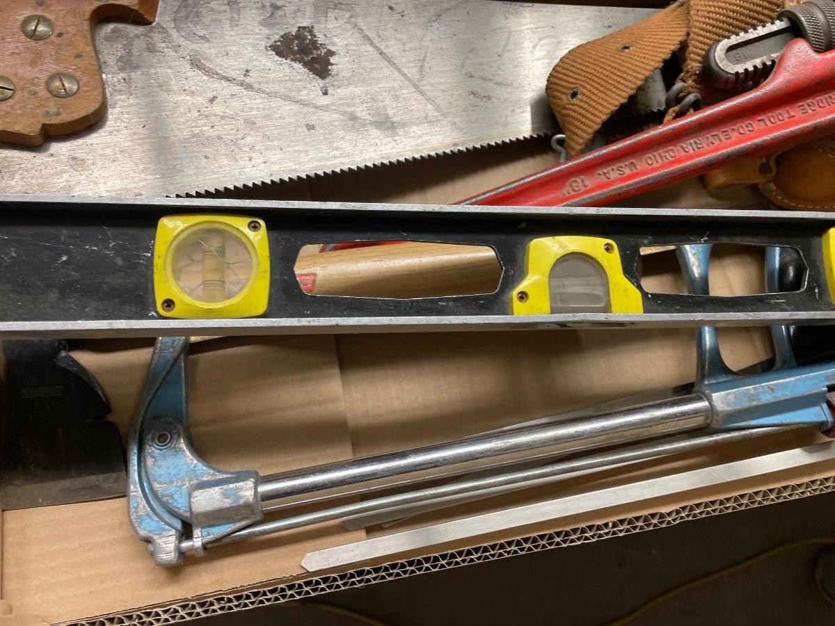 Box of Misc. Tools/Level/Pipe Wrench/Tool belt