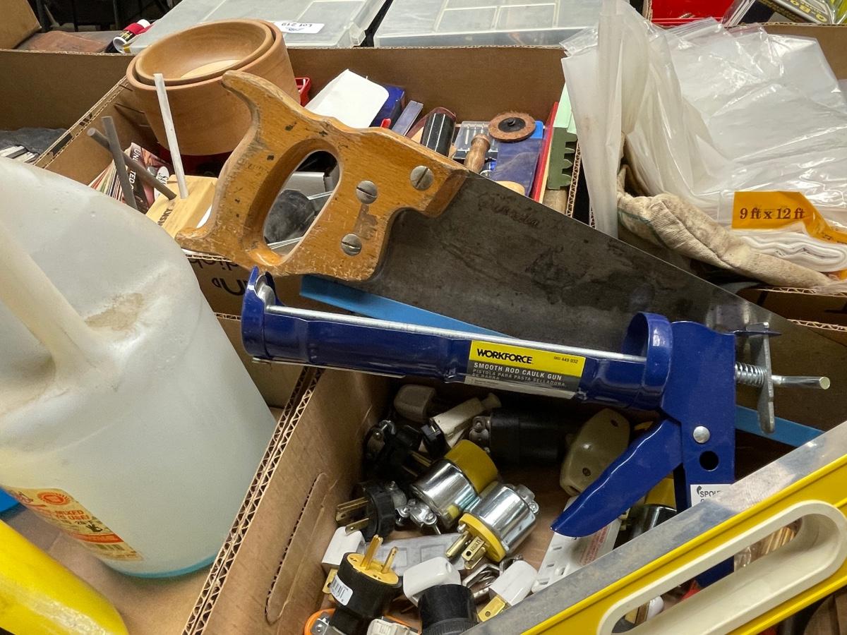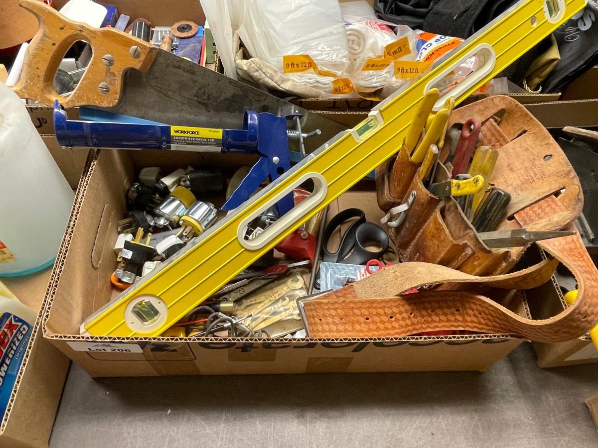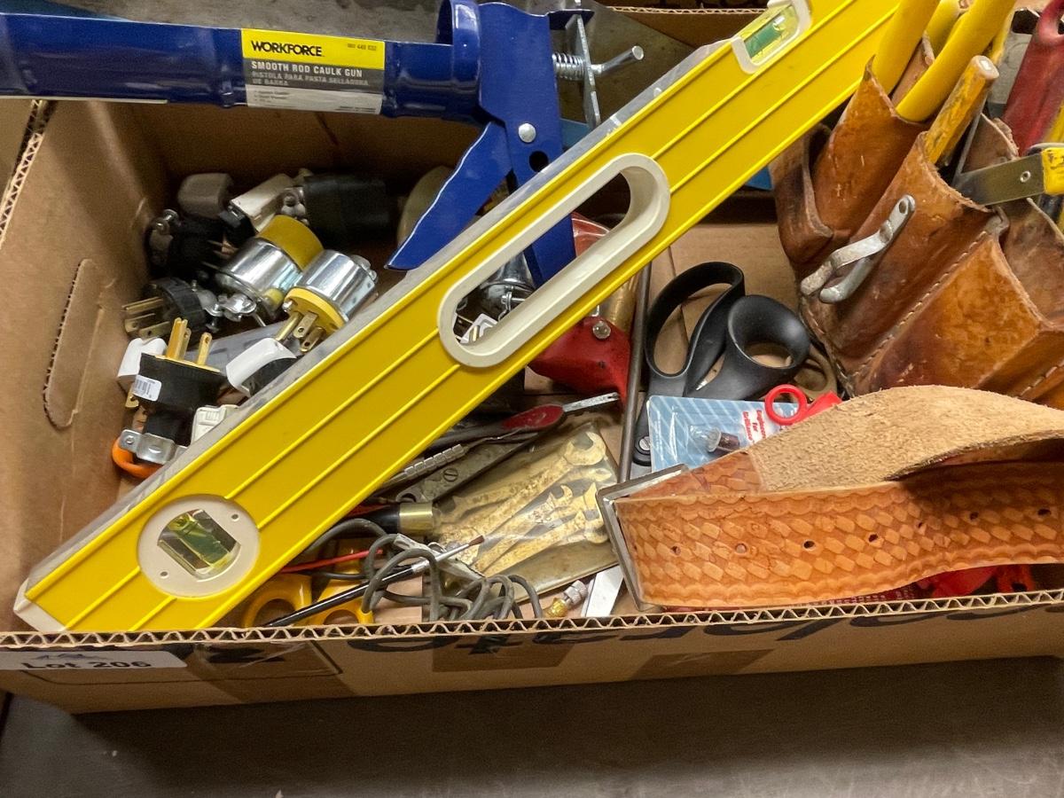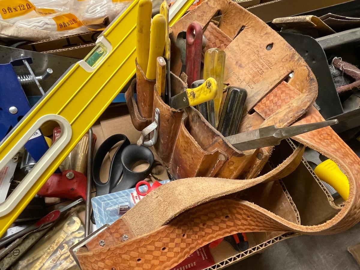 Box of Misc. Tools/Level/Tool Belt/Hand Saw