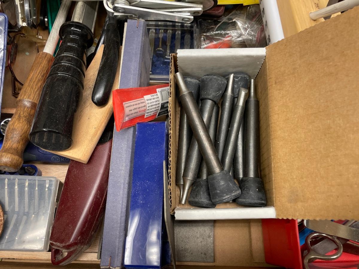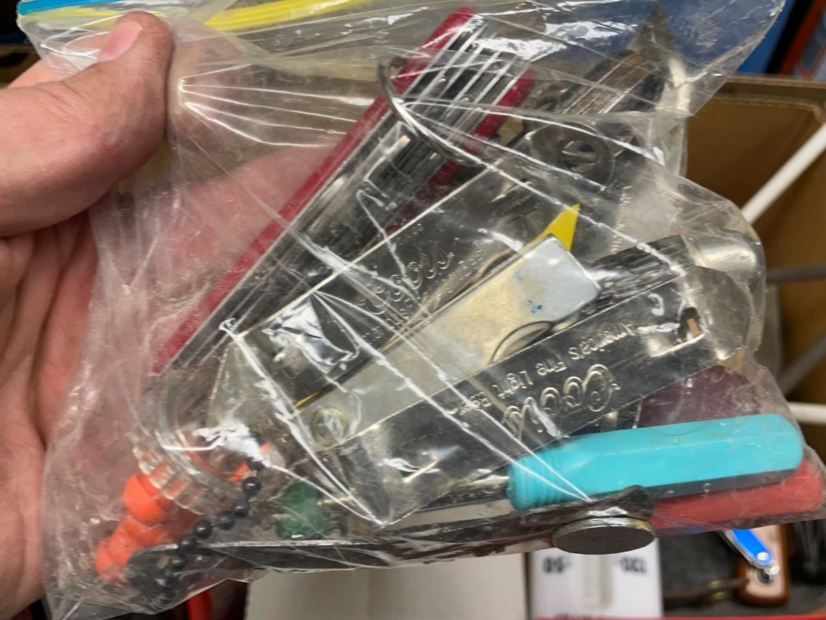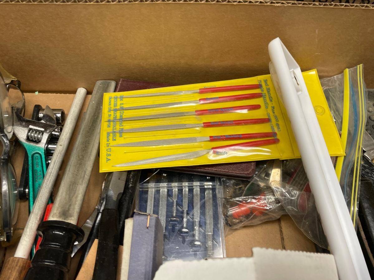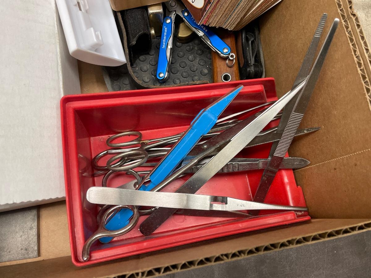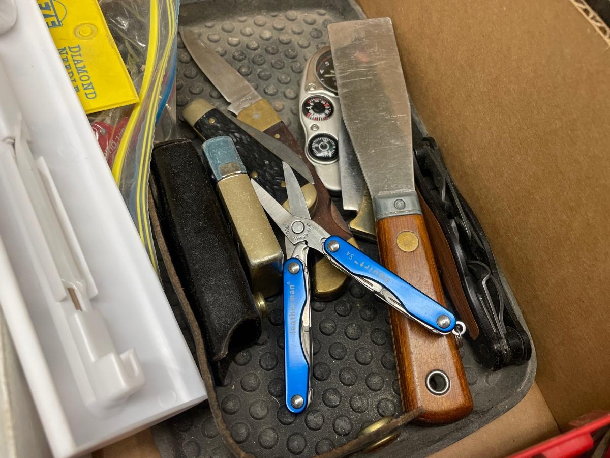 lots of reading glasses/bottle openers/swiss army knife/small ratchet set/multi-tool/sharpeners/wire cutters/lighter & Lots of misc. stuff as shown