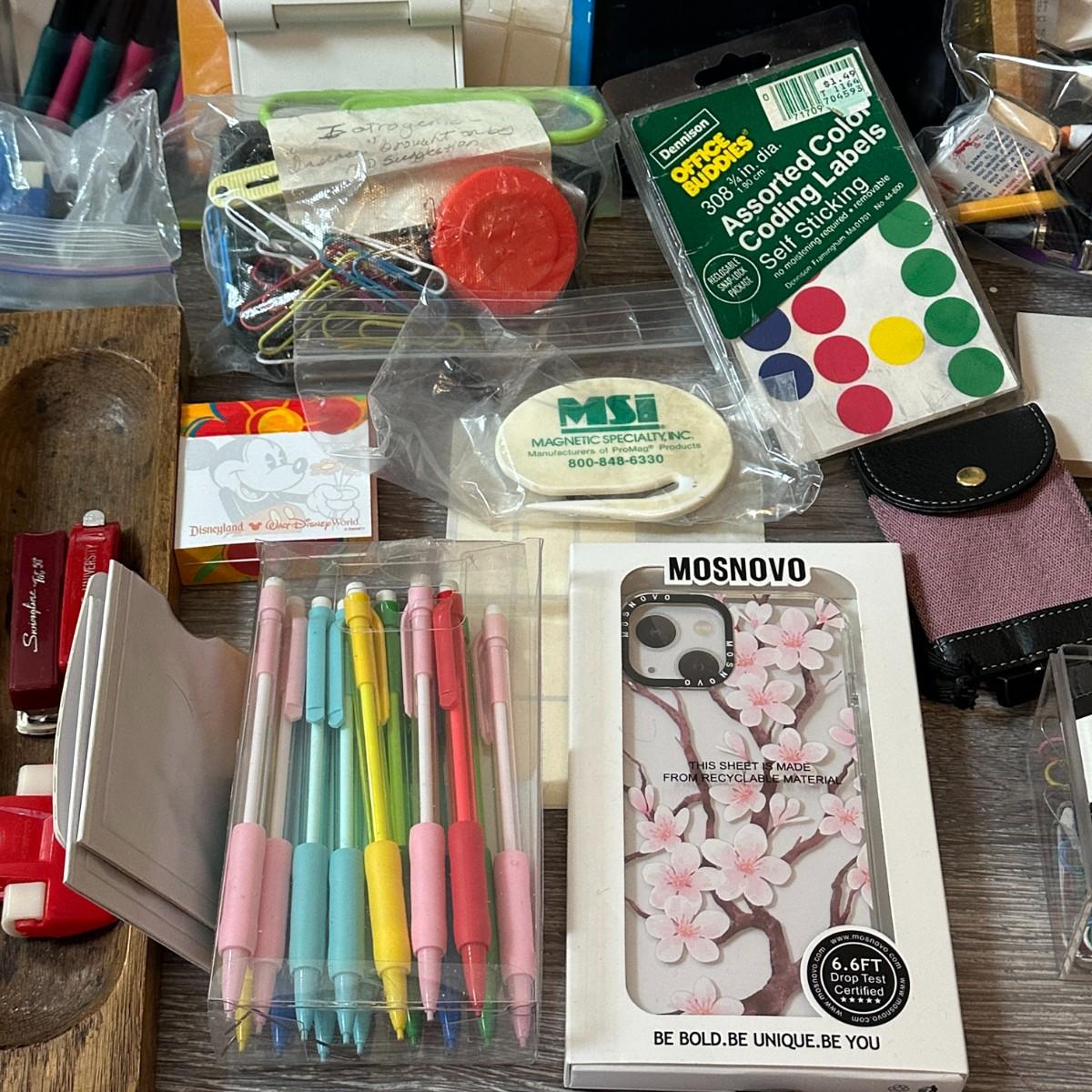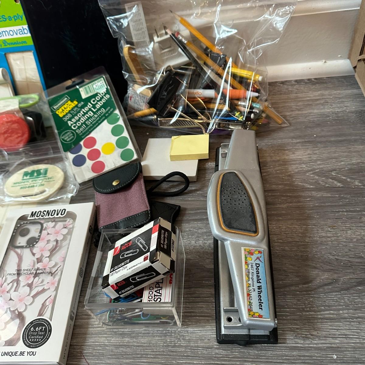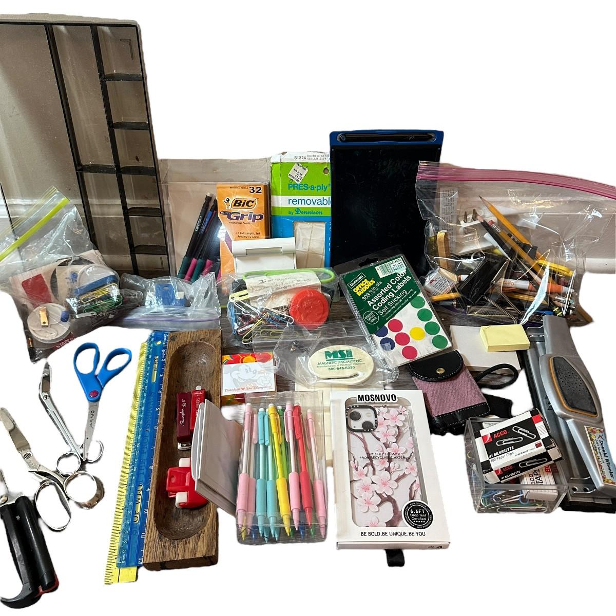 Box of Office-Desk Supplies and Materials- Scissors, pens, hole puncher+