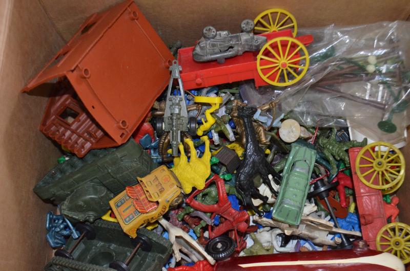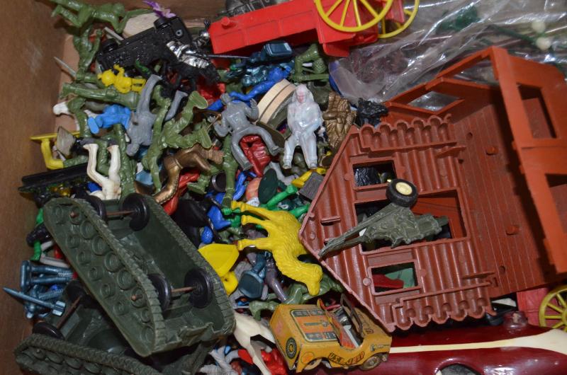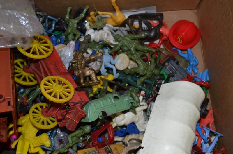 BOX OF OLD TOY CARS COWBOYS ETC