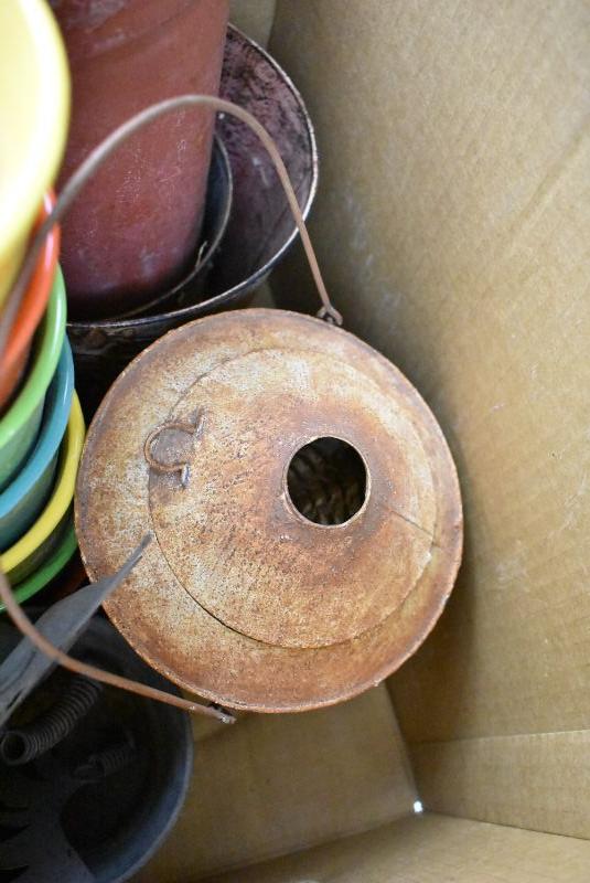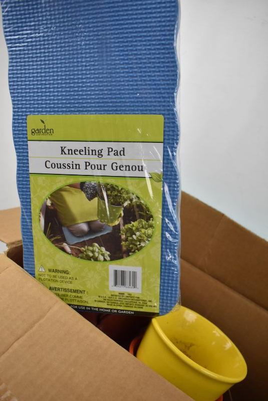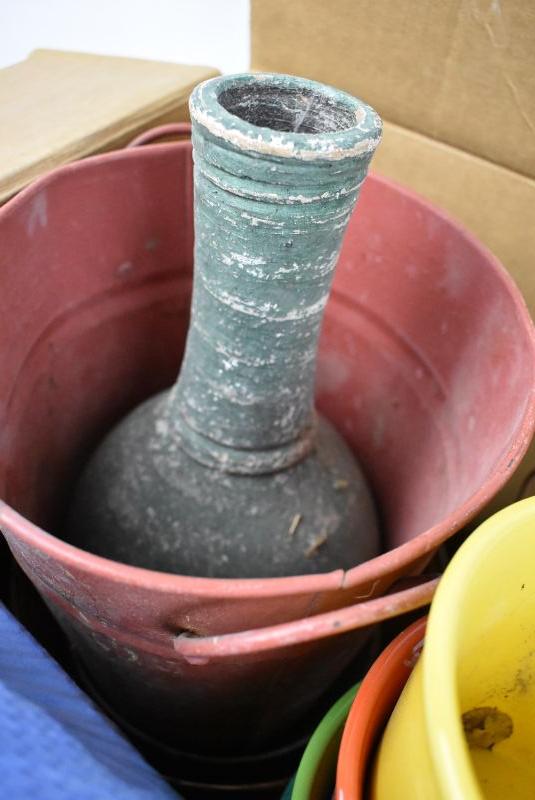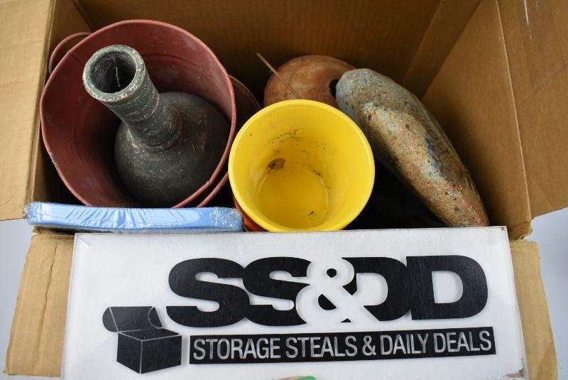 Box of Outdoor Items: Pots & Decor (in pampers box)