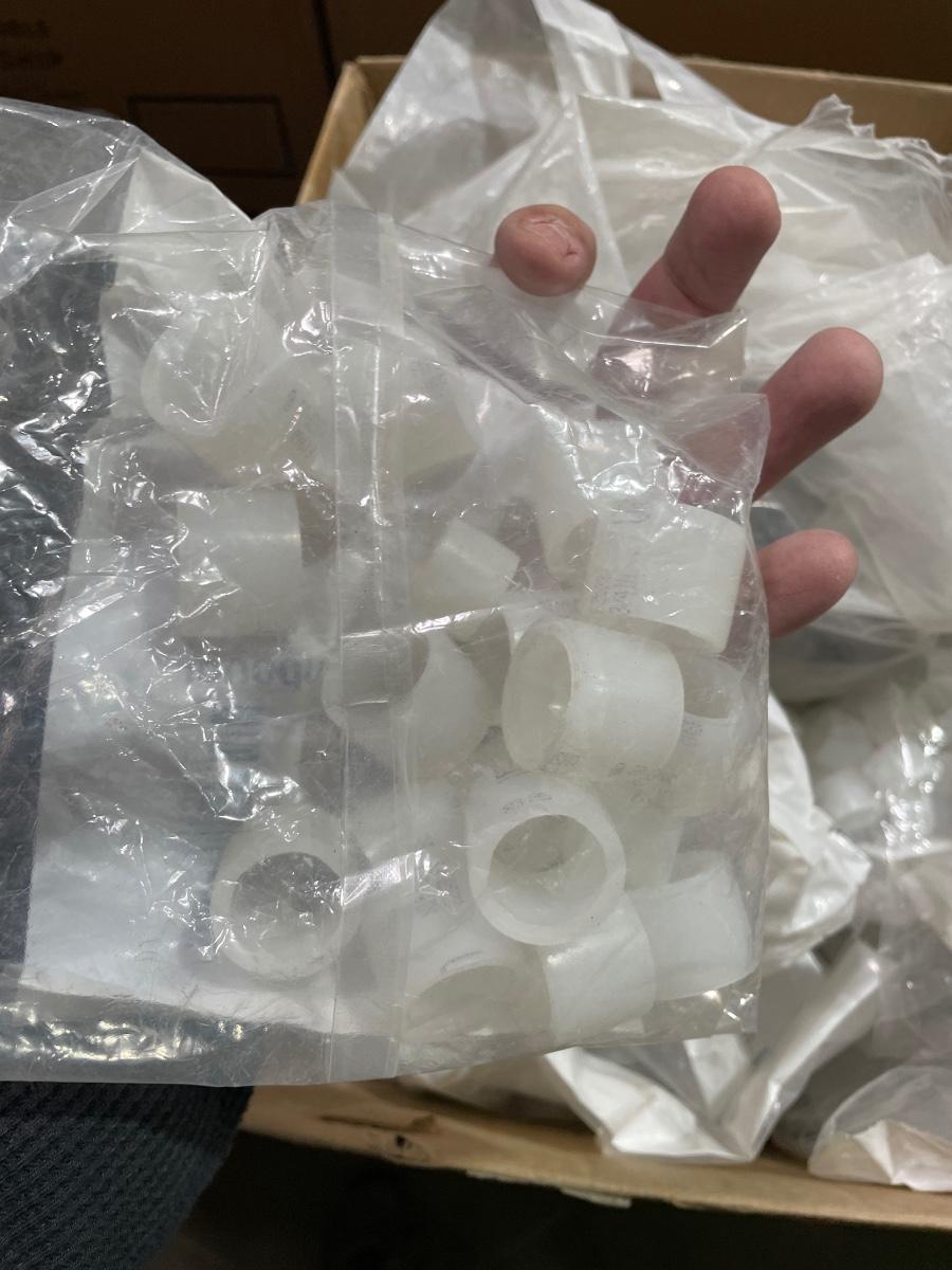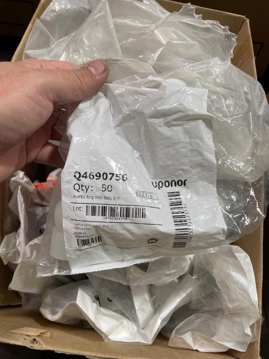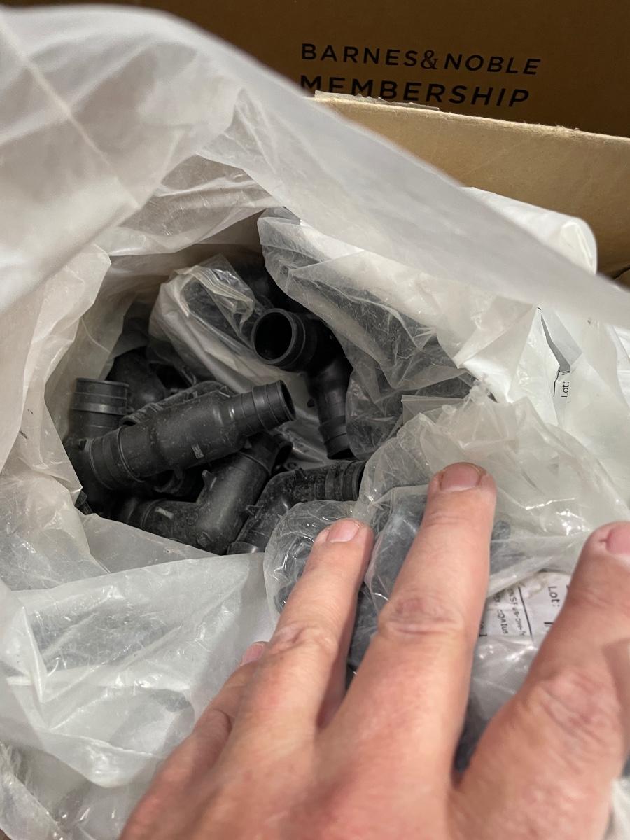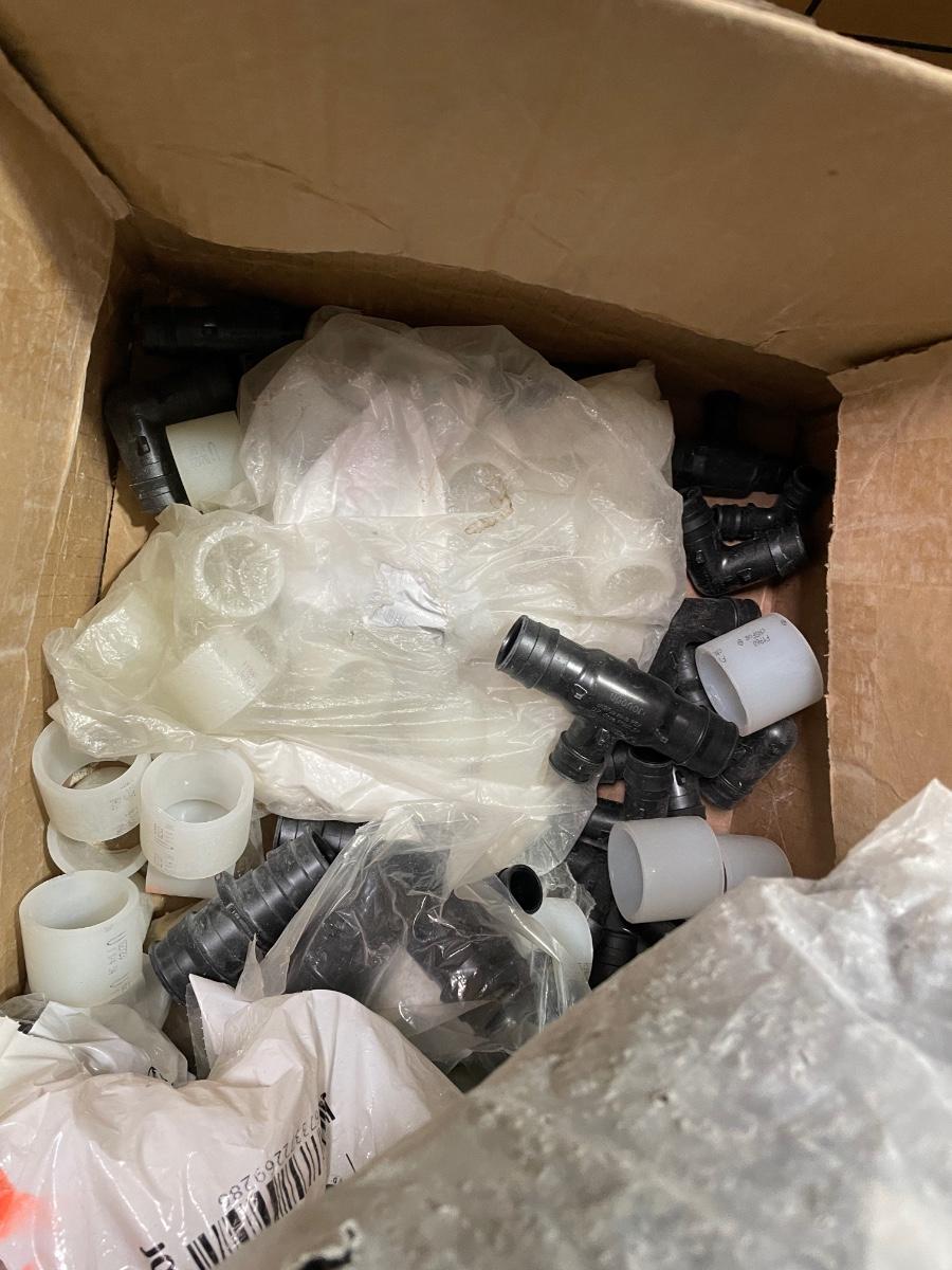 Box of Plastic flex hose connectors/plumbing fixture pieces