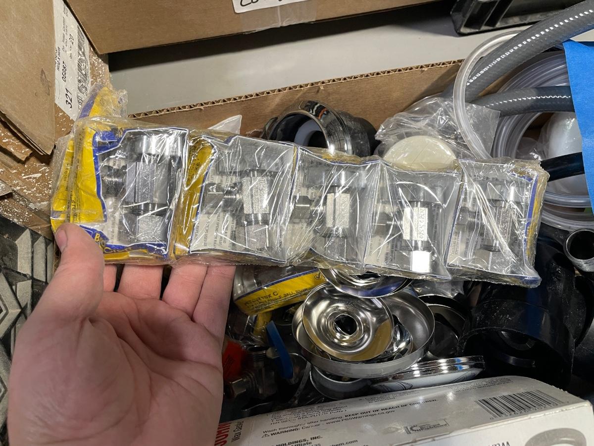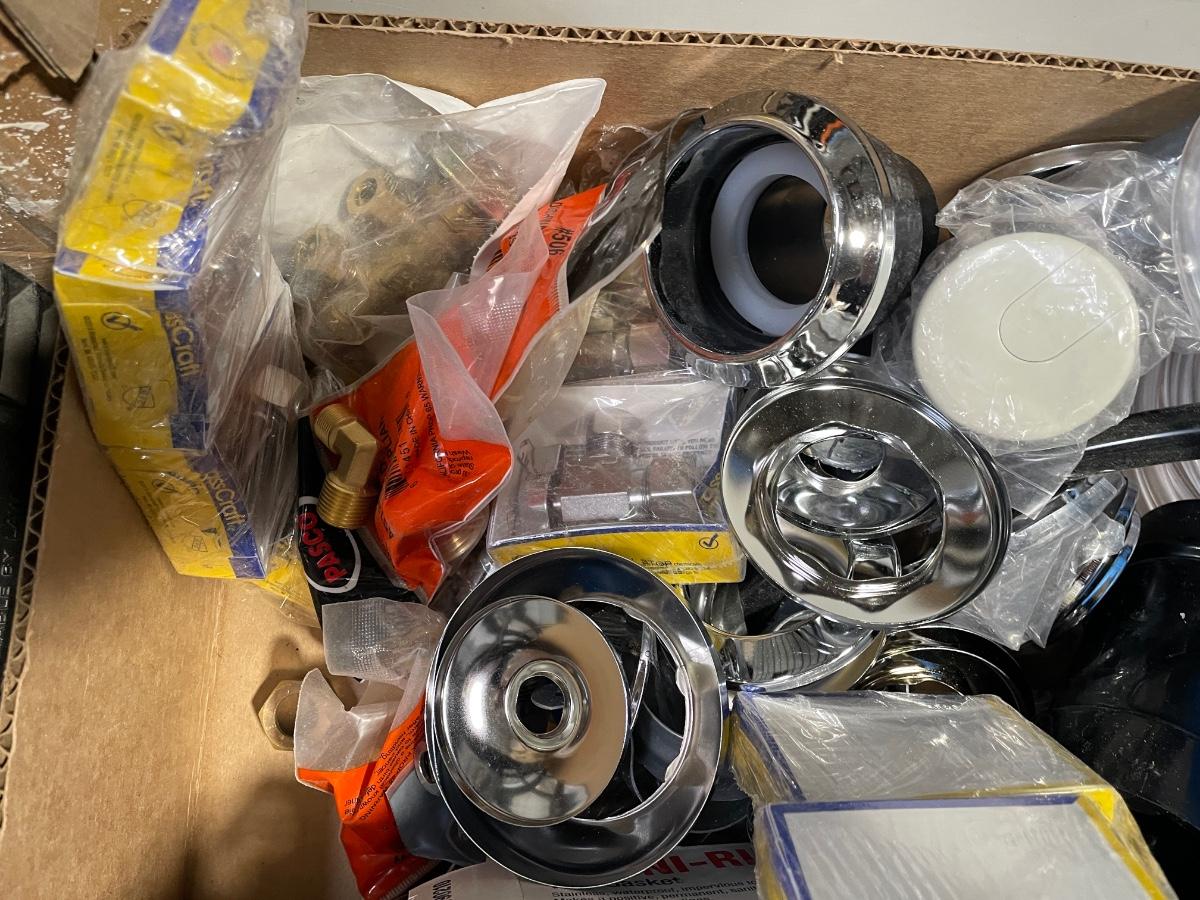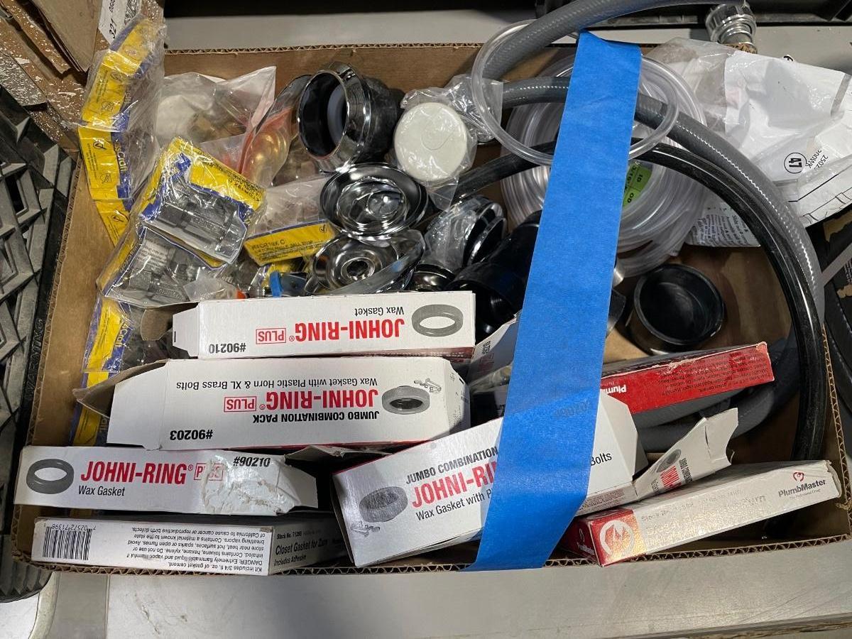 Box of Plumbing Fixtures Supplies/toilet bowl rings/fawcett valves/wall covers
