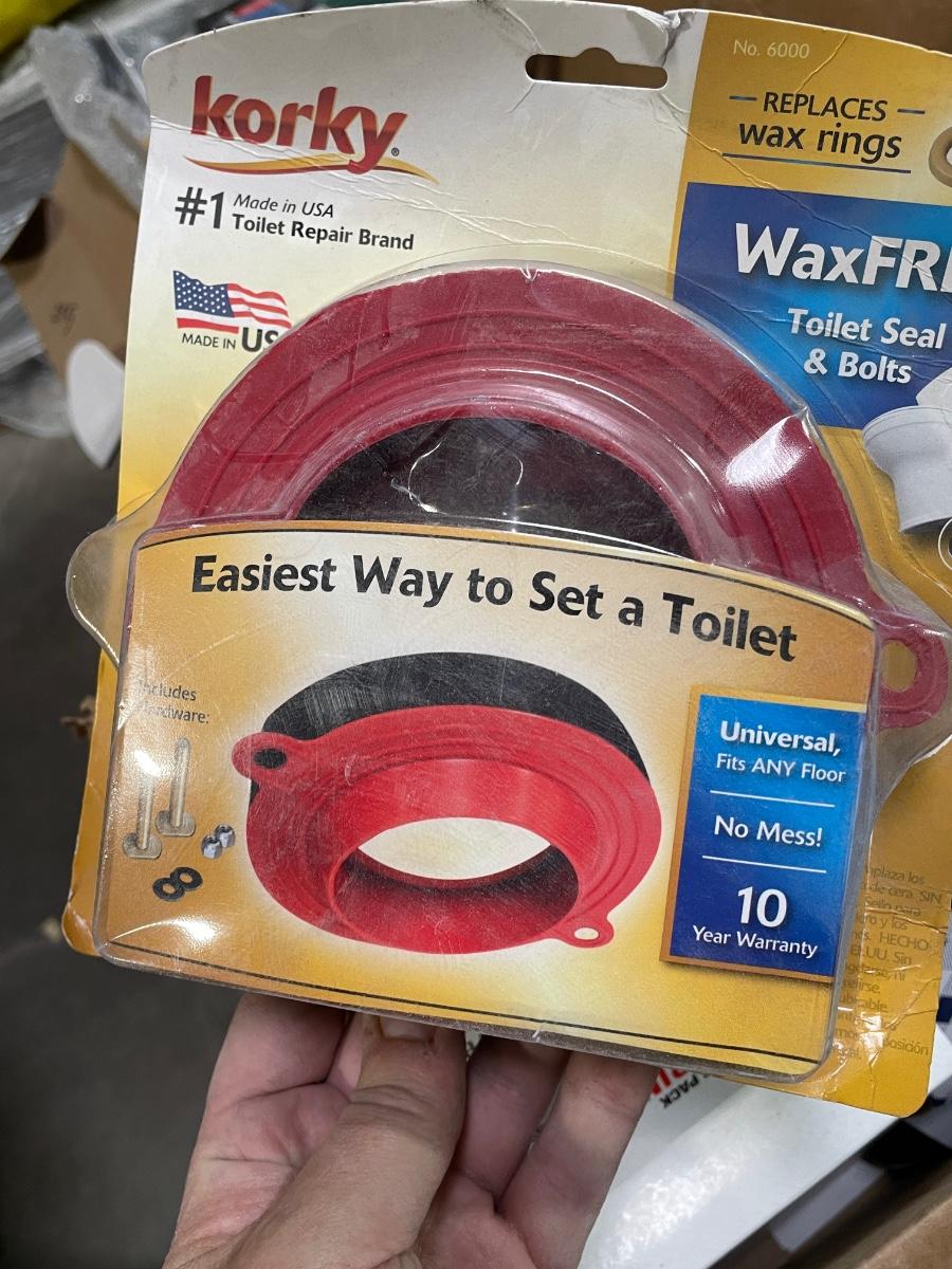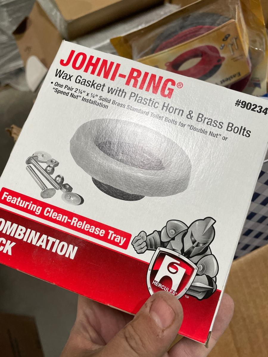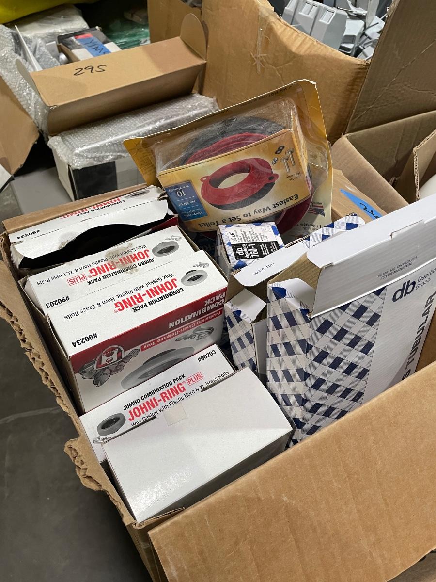 Box of Plumbing Supplies - Toilet Rings, sink components