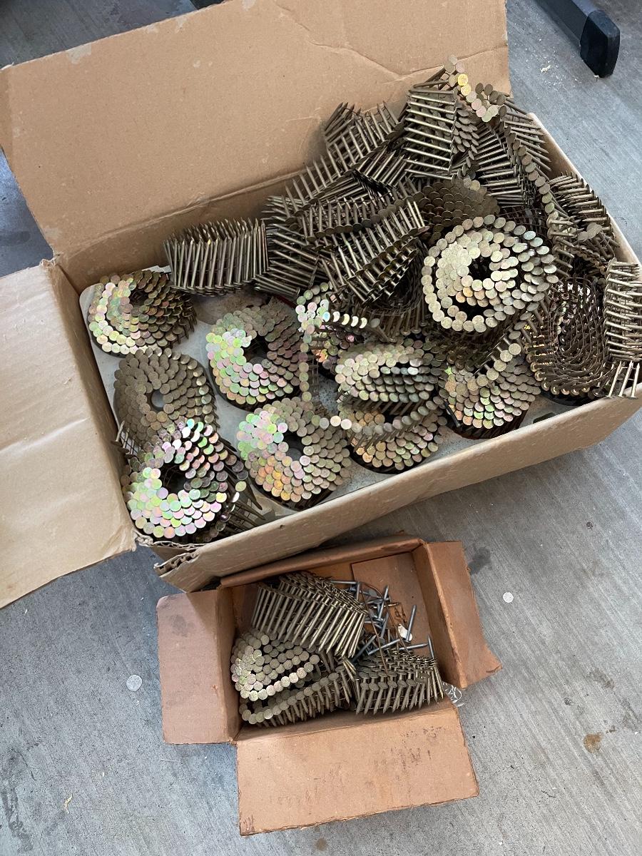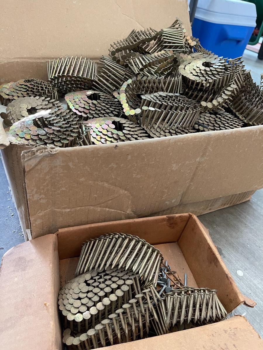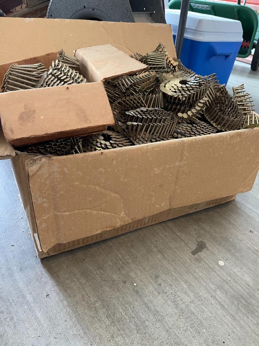8” H x 19” W x12” D box is overflowing with roofing nails.