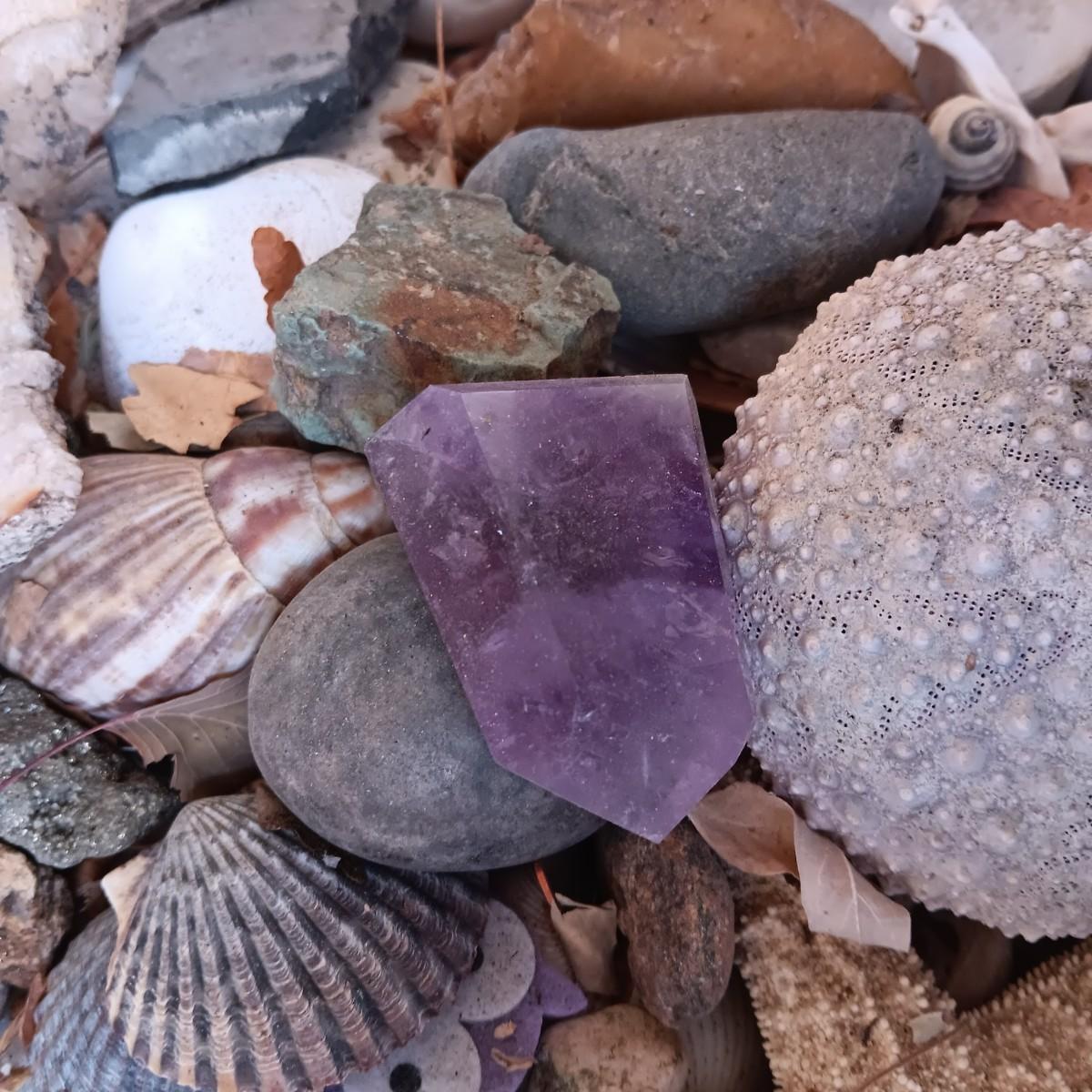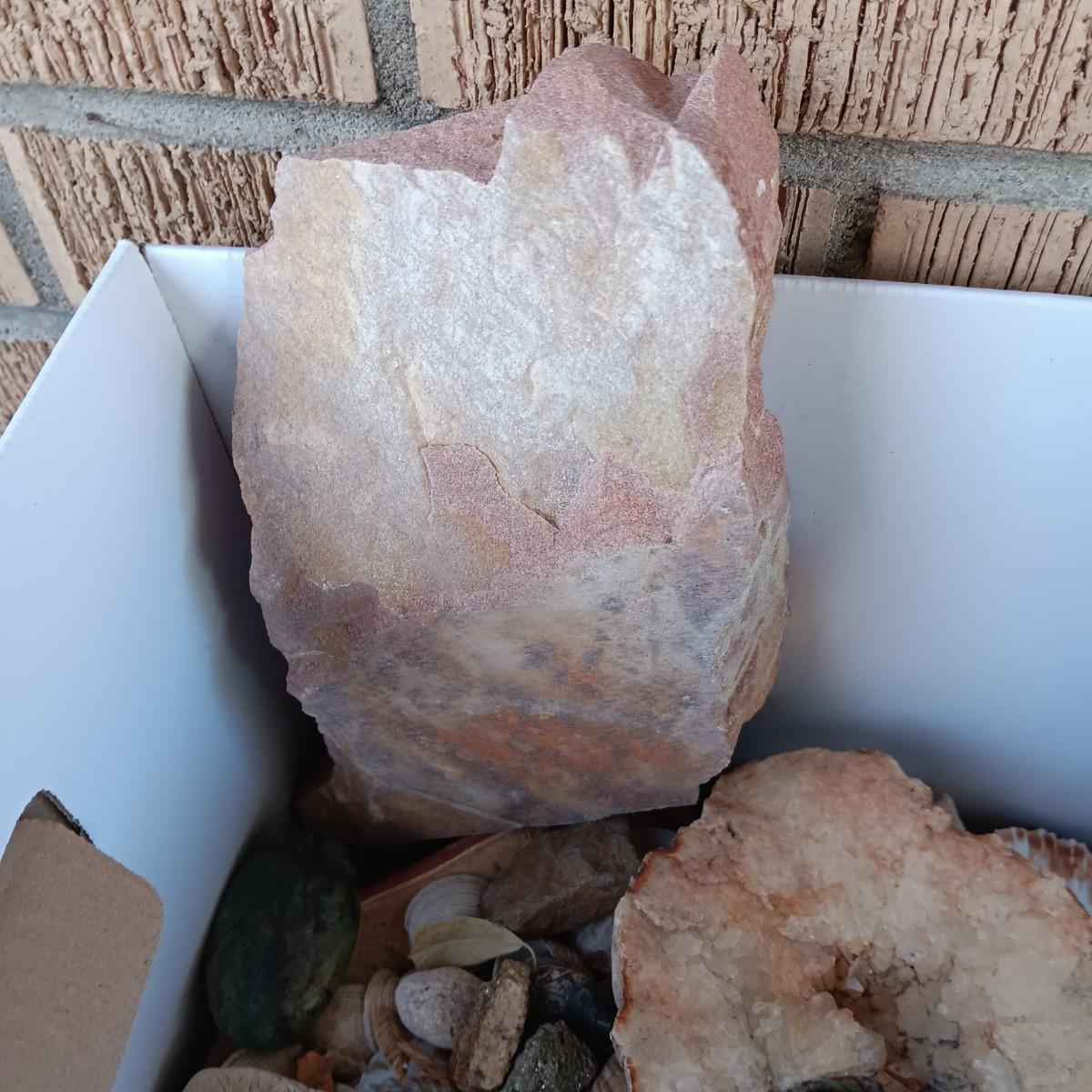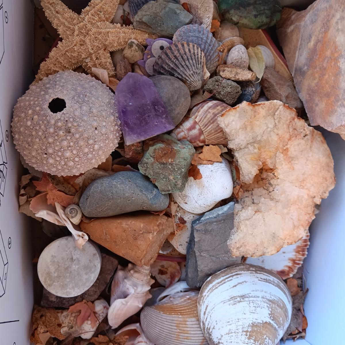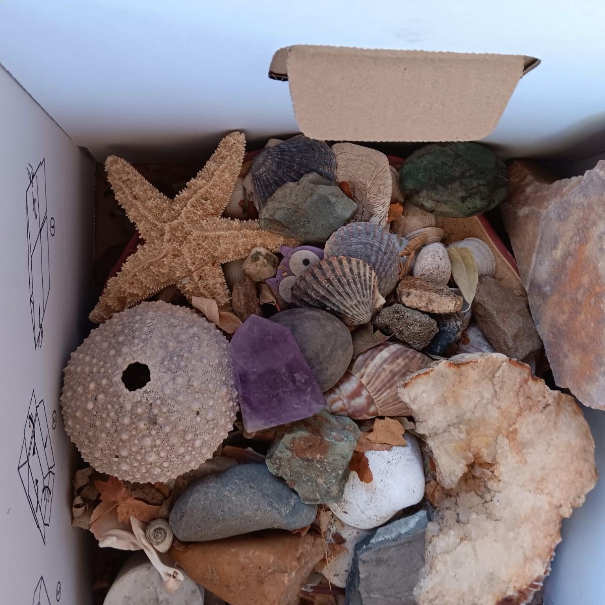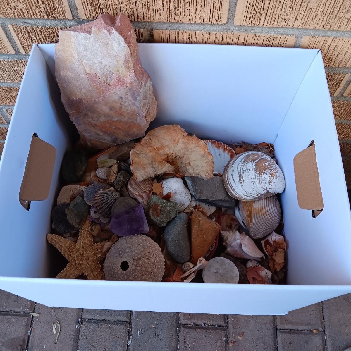 BOX OF SEASHELLS, ROCKS, CRYSTALS ETC