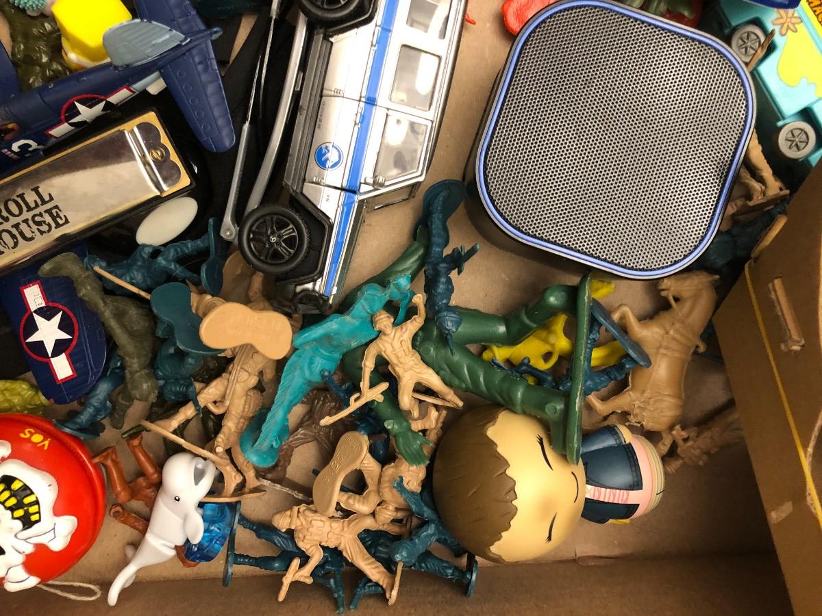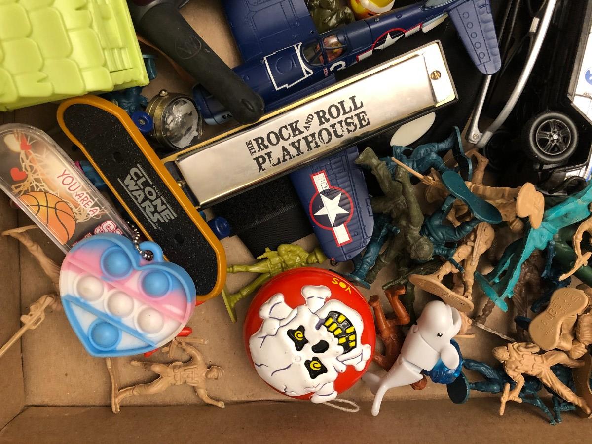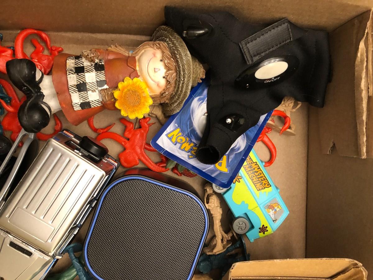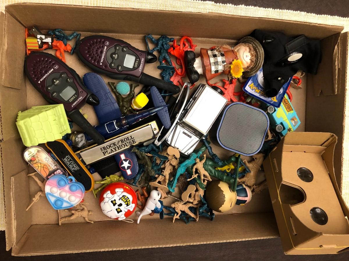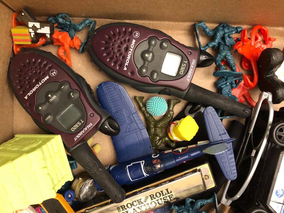 BOX OF SMALL TOYS AND WORKING MOTOROLA 2-WAY RADIOS