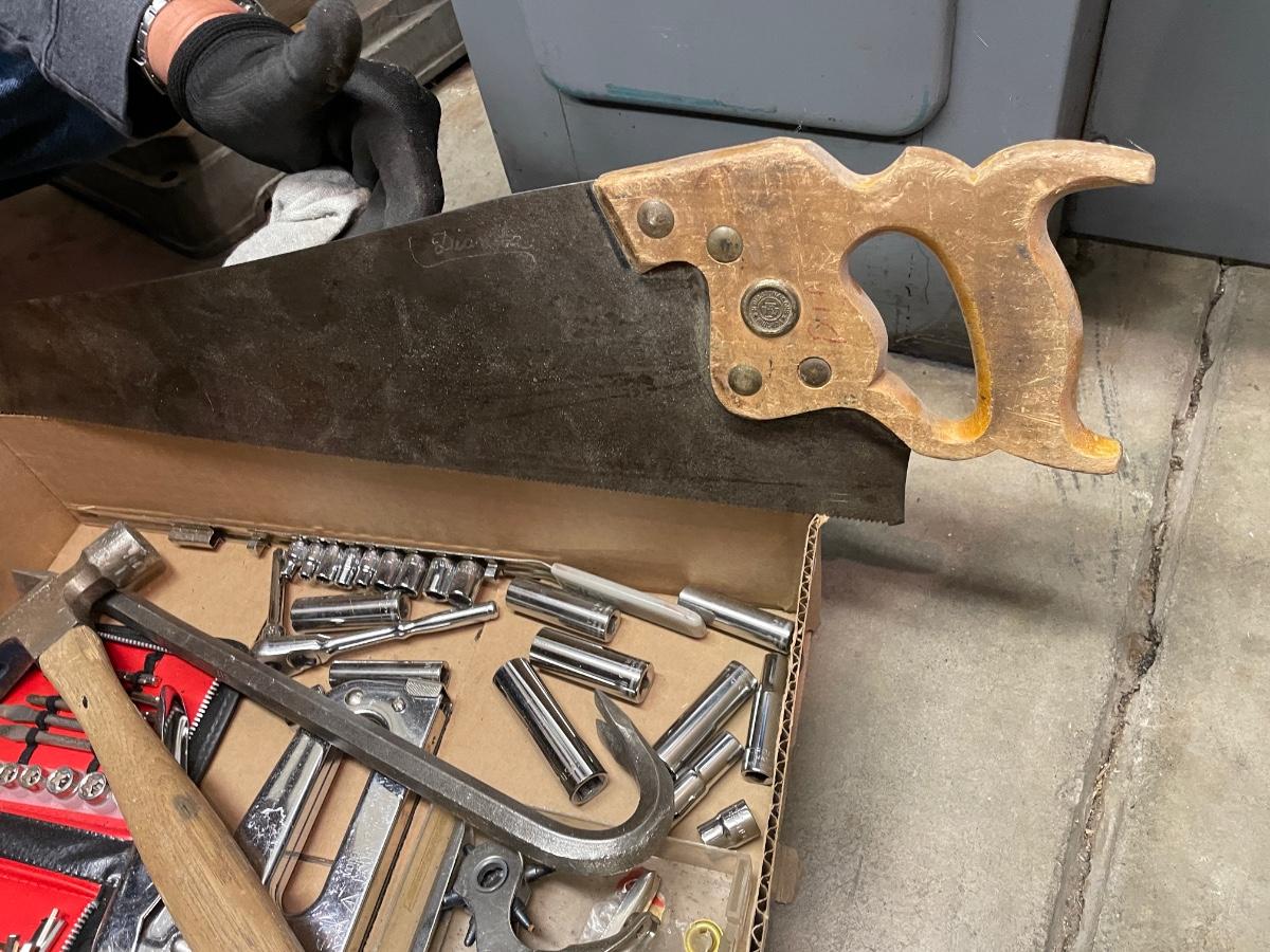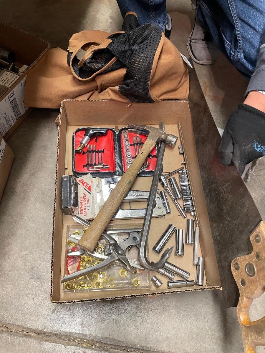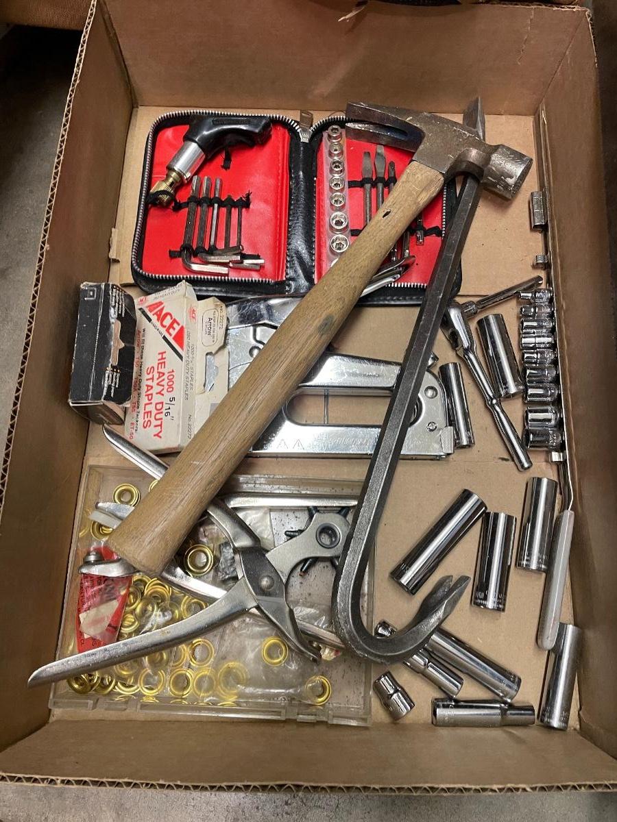 Box of Tools / Sockets / Saw/ Work Apron / Hammer