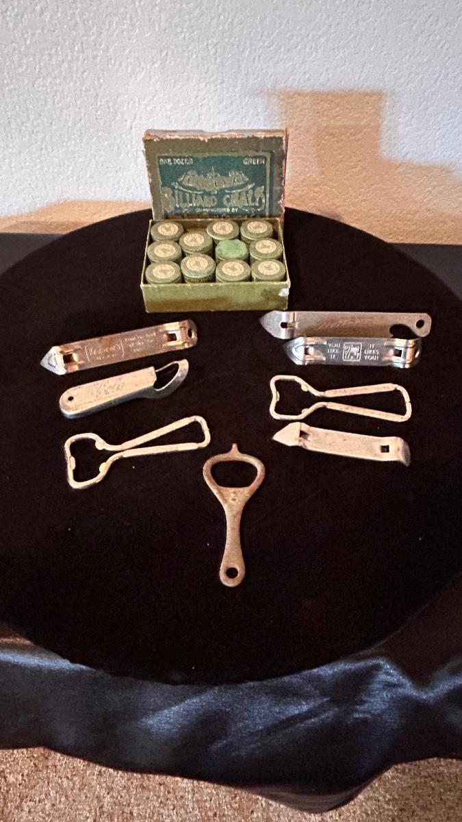 BOX OF VINTAGE BILLIARDS CHALKS, AND AN ASSORTMENT OF BOTTLE OPENERS