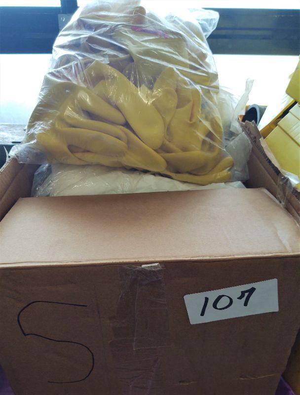 lot 107  - Box of yellow rubber gloves, white disposable coveralls, etc